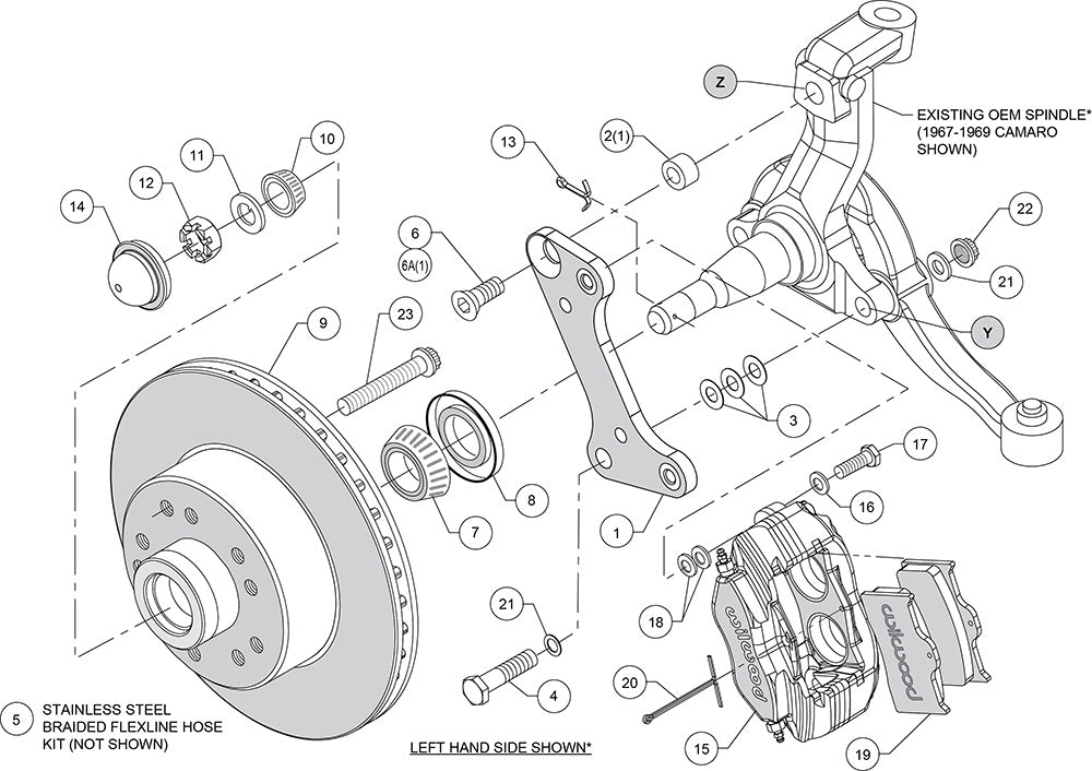 Wilwood's Classic Series front disc brake kits for 1964 to 1974 GM A-body, X-body and 1967-69 F-body offer disc brake upgrade solutions for OEM Drum & Disc brake spindles. These kits feature the FDL-M four piston forged aluminum caliper and 11.00 in diameter x 1.00” thick one-piece rotors. This new kit widens the track by only +.47 in from original drum brake position or narrows by -.03 in from the original disc brake rotor assembly. The FDL-M caliper is a modified version of the time-tested Forged Dynalite caliper, and provides the greatest amount of wheel clearance of any four piston caliper in its size class. Newly updated OEM style one-piece cast iron rotors with integrated hubs with 1/2 in -20 screw in wheel studs simplify installation while providing superb dimensional stability and wear resistance. These versatile kits are easily optioned to suit the braking requirements and style preferences for a daily driver or the most discriminating show enthusiast. Intended vehicle applications require no modifications for installation, and clear most 14 in OEM wheels. Classic Series FDL-M kits can be used with either manual or power boost master cylinders, and come complete with calipers, rotors, brackets, hardware, braided steel line kit and detailed installation instructions.