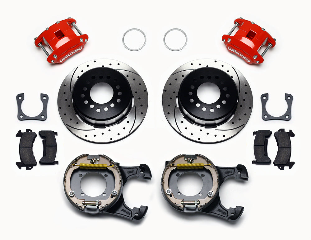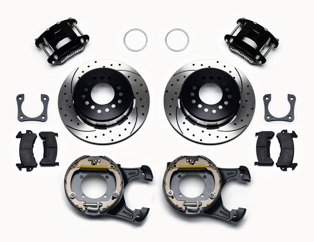 D154 Pro-Series rear disc kits provides a complete solution for popular muscle car rear axles that require a parking brake. Forged D154 dual piston calipers, 12.19” one-piece drum/rotors, and high friction pads provide optimized and balanced braking for all types of custom performance street/strip and show machines. The neatly hidden internal shoe system provides a clean installation with superior static holding power for parking. D154 rear caliper kits offer a complimentary match to vehicles using Wilwood D52 or D154 calipers on OE spindles. Optional caliper finishes and rotor designs enable the builder to personalize the style and optimize brake performance.