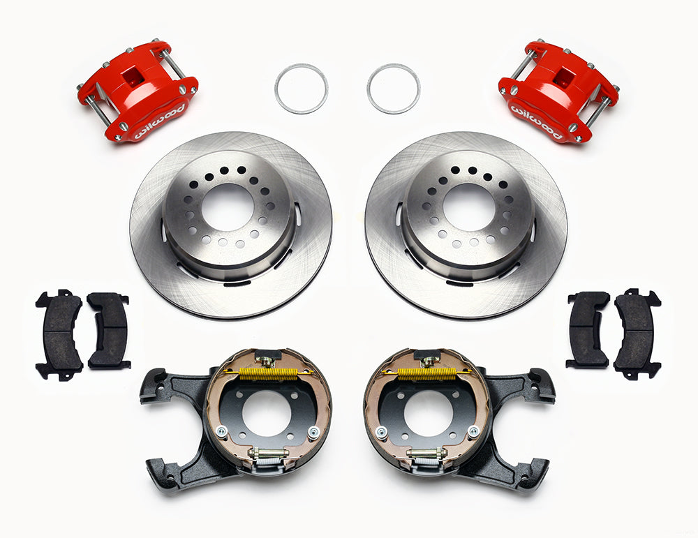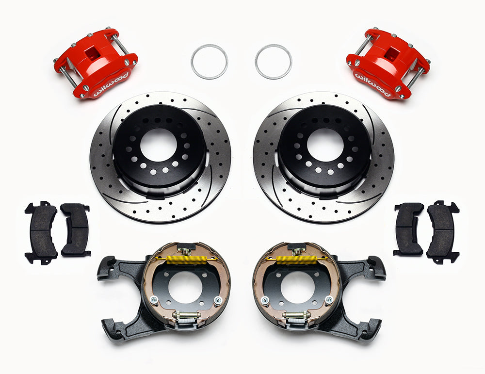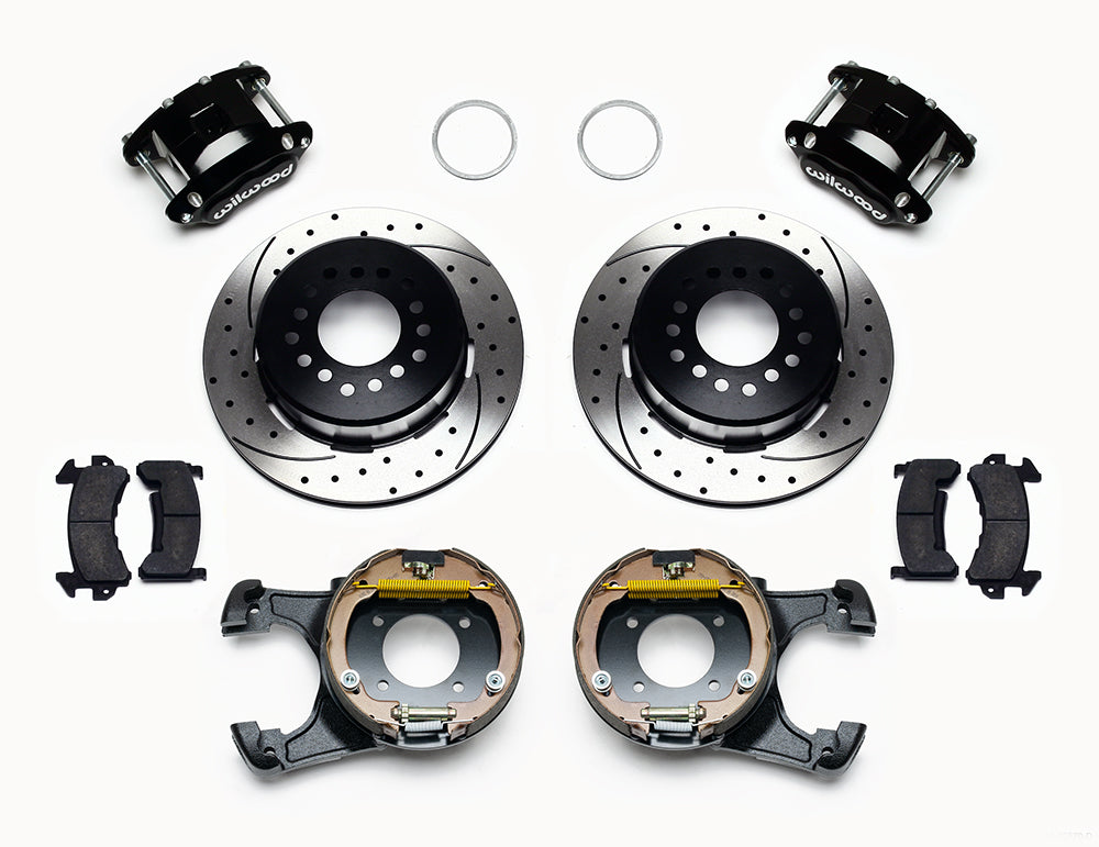 D154 Pro-Series rear disc kits provides a complete solution for popular muscle car rear axles that require a parking brake. Forged D154 dual piston calipers, 12.19” one-piece drum/rotors, and high friction pads provide optimized and balanced braking for all types of custom performance street/strip and show machines. The neatly hidden internal shoe system provides a clean installation with superior static holding power for parking. D154 rear caliper kits offer a complimentary match to vehicles using Wilwood D52 or D154 calipers on OE spindles. Optional caliper finishes and rotor designs enable the builder to personalize the style and optimize brake performance.