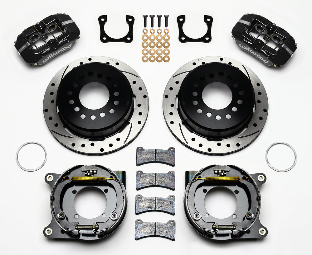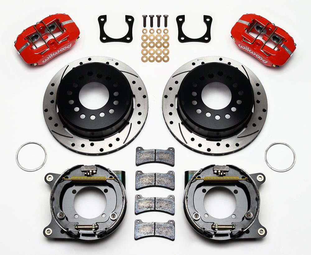 Forged Dynapro Low-Profile Pro-Series rear disc brake kits provide a complete solution for popular muscle car rear axles on applications that require a parking brake assembly and extra clearance for 14.00” to 15.00” rim applications. Forged billet Dynapro Low-Profile four-piston calipers 11.00” one-piece hat and rotor assemblies, and high friction pads provide optimized and balanced braking for all types of custom performance street/strip and show machines. The neatly hidden internal shoe system provides a clean installation with superior static holding power for parking. Optional caliper finishes and rotor designs enable the builder to personalize the style and optimize brake performance for every individual application.