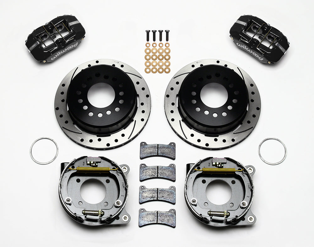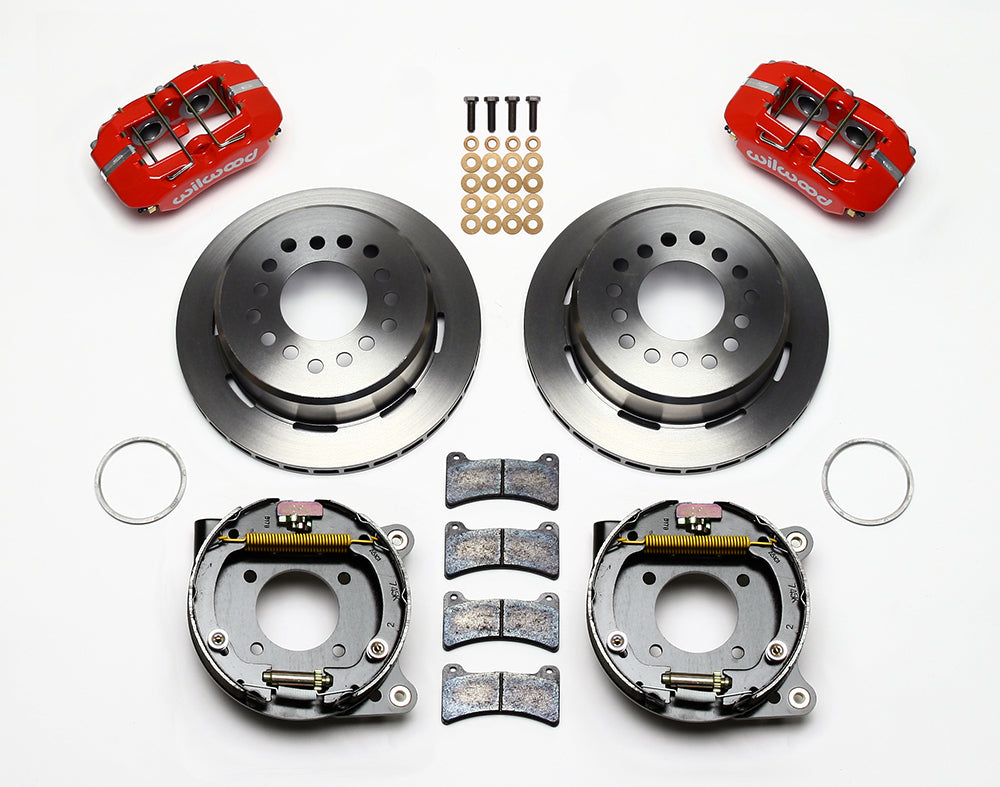 Forged Dynapro Low-Profile Pro-Series rear disc brake kits provide a complete solution for popular muscle car rear axles on applications that require a parking brake assembly and extra clearance for 14.00” to 15.00” rim applications. Forged billet Dynapro Low-Profile four-piston calipers 11.00” one-piece hat and rotor assemblies, and high friction pads provide optimized and balanced braking for all types of custom performance street/strip and show machines. The neatly hidden internal shoe system provides a clean installation with superior static holding power for parking. Optional caliper finishes and rotor designs enable the builder to personalize the style and optimize brake performance for every individual application.