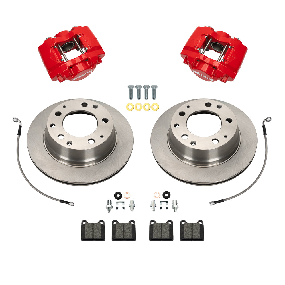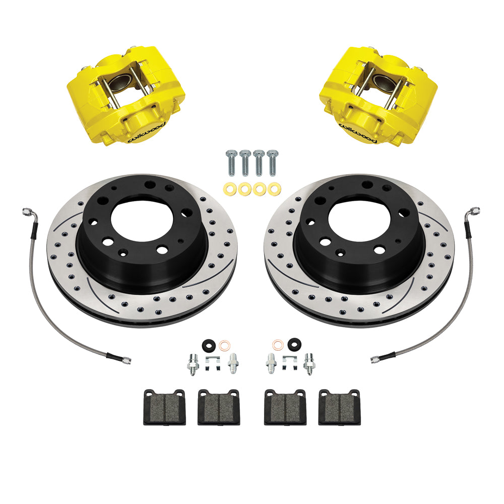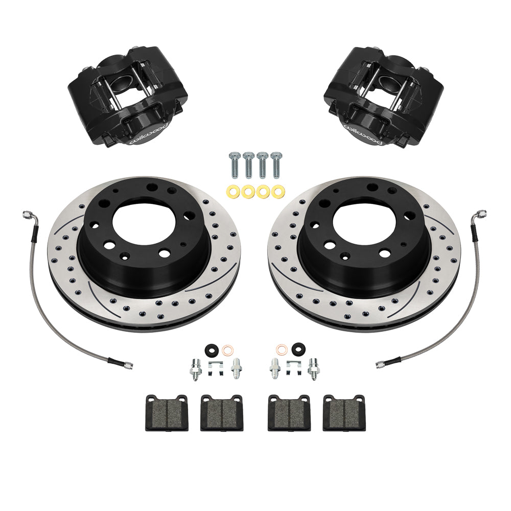 Wilwood's D31 Rear Brake Kits utilizing our forged aluminum D31 direct mount calipers provide the ultimate in strength, weight savings, and high efficiency brake clamping for Porsche 911 with in M in 3.00 in OEM rear calipers. These calipers feature a high strength, lightweight 4.1-pound forged aluminum body fitted with machined stainless-steel pistons. D31 series calipers utilize the same 3.00 in mounting centers, height and offset as the traditional 911 in M in calipers and contain standard D31 brake pads in BP-10 compound, OEM replacement 11.42” diameter and 0.79” or 0.95 in thickness rotors in either a plain face surface or an SRP directional drilled and slotted configuration with a black e-coat finish. D31 calipers are offered in Black and Red powder coat finishes and can be also special ordered with yellow powder coat, Type III hard anodize or any of the special powder coat colors available at an extra charge. Kits include DOT compliant stainless braided brake hoses.