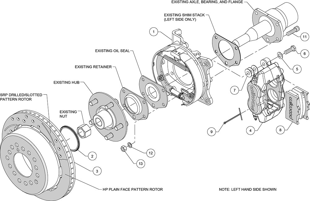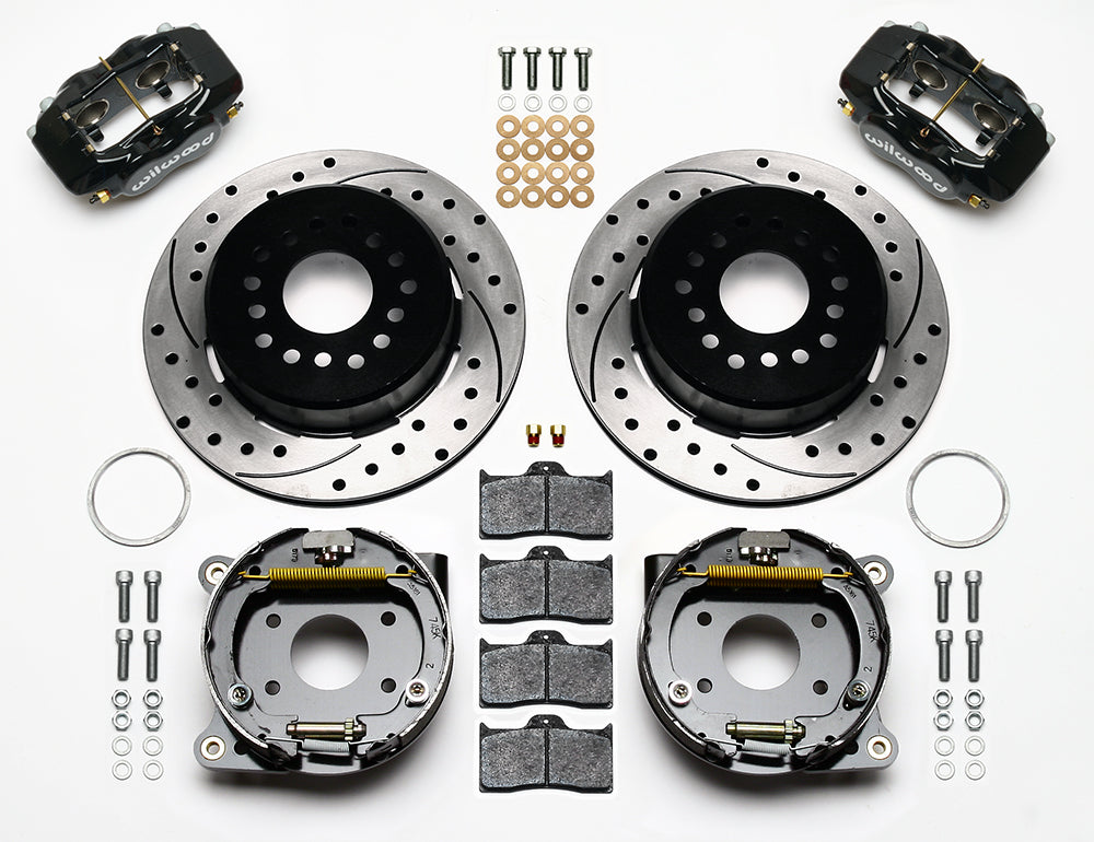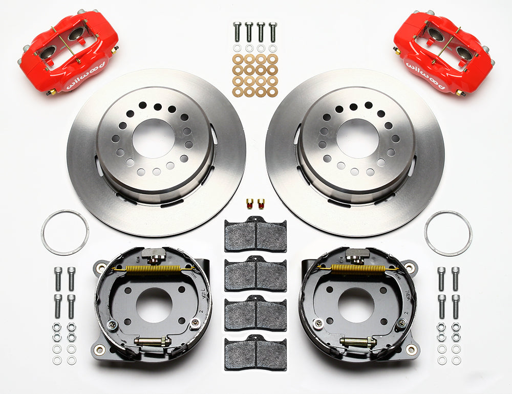 This group of FDL Pro-Series rear disc kits provides a complete solution for popular muscle car rear axles that require a parking brake. Forged billet Dynalite four piston calipers, 12.19” one-piece drum/rotors, and high friction pads provide optimized and balanced braking for all types of custom performance street/strip and show machines. The neatly hidden internal shoe system provides a clean installation with superior static holding power for parking. Optional caliper finishes and rotor designs enable the builder to personalize the style and optimize brake performance for every individual application.