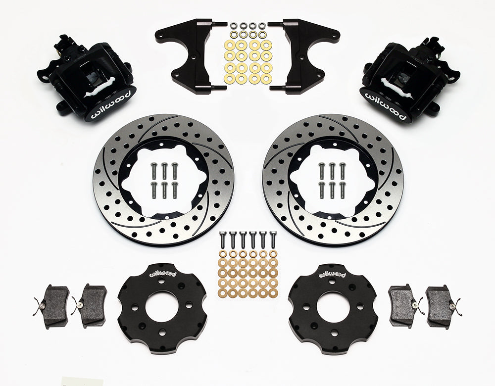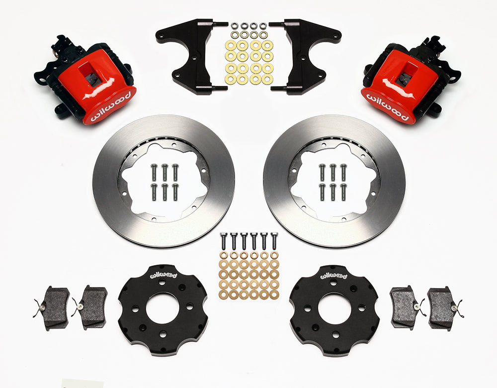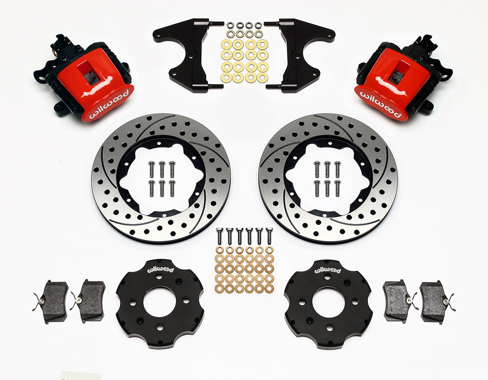 Combination hydro-mechanical Parking Brake calipers use hydraulic pressure from the master cylinder for stopping power, and an internal mechanical lock within the caliper for a parking brake. CPB kits are built primarily for front wheel drive vehicles, and select rear wheel drive axles that are not well suited for internal shoe style parking brakes. The calipers are coupled with oversized two-piece rotor assemblies with aluminum hats and high friction BP-10 compound pads. CPB kits provide the correct balanced brake performance and matching style to compliment front big brake upgrade kits.