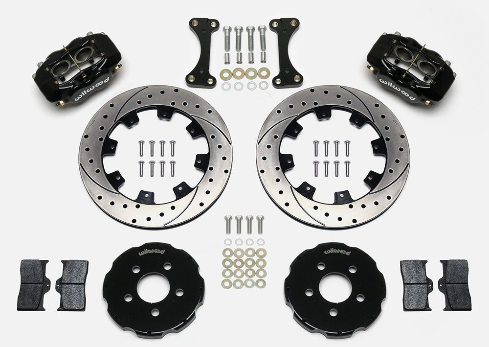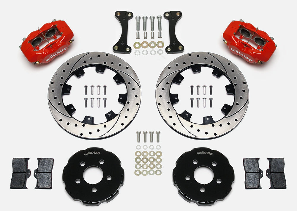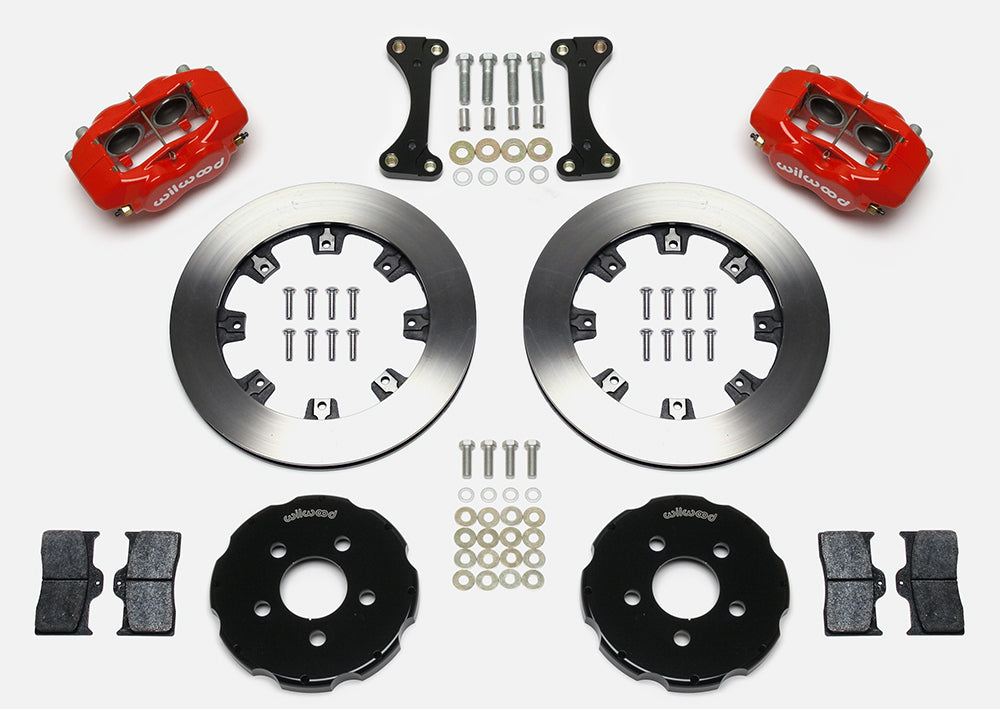 Forged Dynalite ProSeries kits provide high performance, big brake stopping power by combining modern brake technology with high-tech styling to update the brakes on your front-wheel-drive sport compact vehicle. The OE calipers and rotors are replaced with forged aluminum, four-piston calipers mounted over larger diameter, certified alloy 30-vane vented iron rotors. The new two-piece rotor assemblies provide weight-saving forged aluminum mounting hats. The calipers feature an increase in effective piston volume to deliver higher clamping power with less pedal effort than stock. The thicker, vented rotor design adds cooling efficiency and durability to extend service life. BP-series SmartPads add high-response with increased resistance to fade and longer wear over typical OE replacement pads. Options for caliper colors and rotor styles are available to personalize the look on any car. For on-track driving enthusiasts, additional track-only fortifications are available on a custom order basis by contacting the technical staff at the factory.