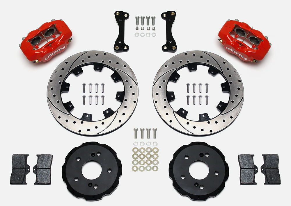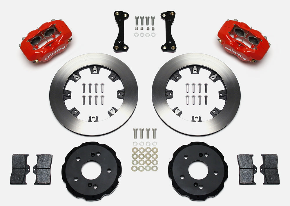 Forged Dynalite ProSeries kits provide high performance, big brake stopping power by combining modern brake technology with high-tech styling to update the brakes on your front-wheel-drive sport compact vehicle. The OE calipers and rotors are replaced with forged aluminum, four-piston calipers mounted over larger diameter, certified alloy 30-vane vented iron rotors. The new two-piece rotor assemblies provide weight-saving forged aluminum mounting hats. The calipers feature an increase in effective piston volume to deliver higher clamping power with less pedal effort than stock. The thicker, vented rotor design adds cooling efficiency and durability to extend service life. BP-series SmartPads add high-response with increased resistance to fade and longer wear over typical OE replacement pads. Options for caliper colors and rotor styles are available to personalize the look on any car. For on-track driving enthusiasts, additional track-only fortifications are available on a custom order basis by contacting the technical staff at the factory.