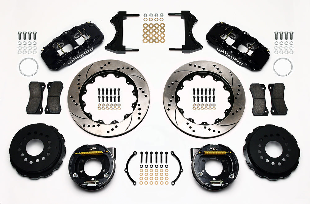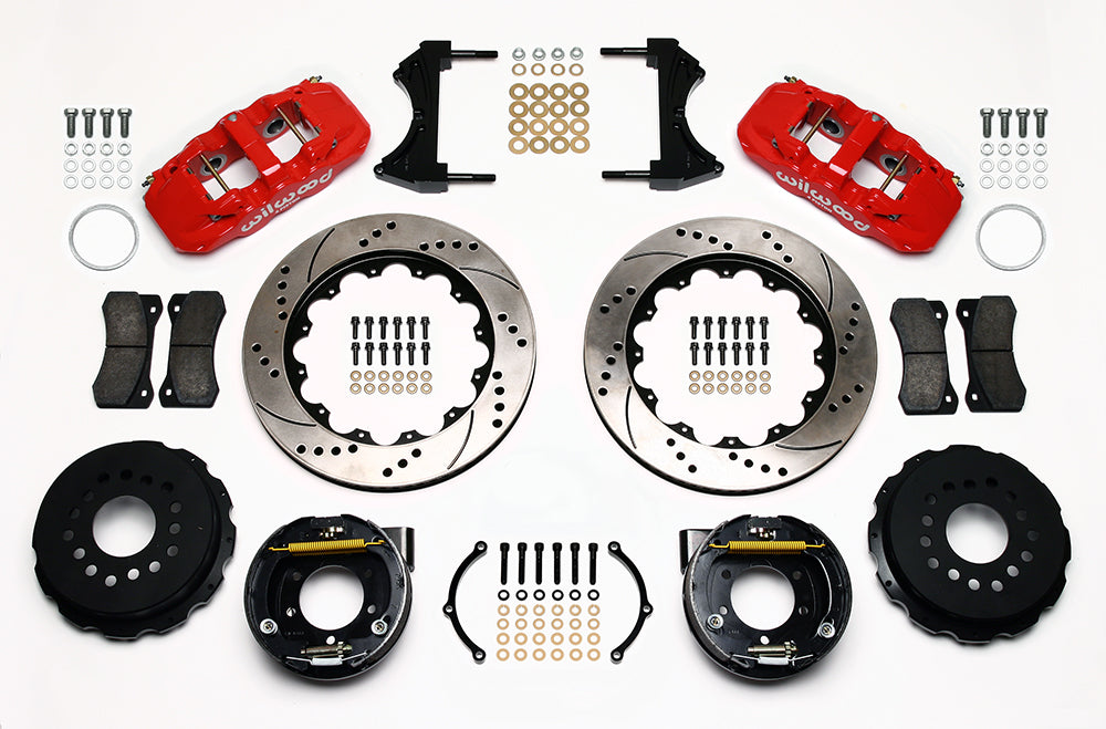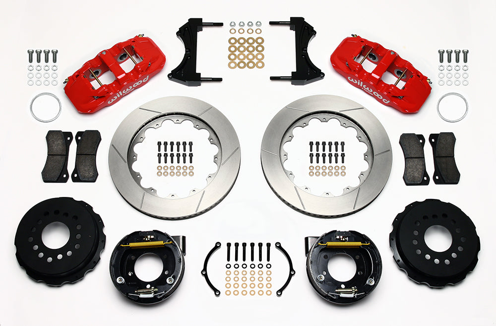 AERO4 Big Brake Rear Axle Kits replace the factory disc brakes and use the OE parking brake assembly as a compliment to front big brake upgrades on late model high performance vehicles. High capacity braking from the AERO4 radial mount calipers, High friction BP compound pads, and oversized 14.00 in rotors are matched to the OE master cylinder output, ABS function, and individual vehicle bias requirements. Enhanced brake performance, increased durability, and high-tech style compliment big wheel, tire, and suspension upgrades on customized vehicles and all others with increased brake requirements.