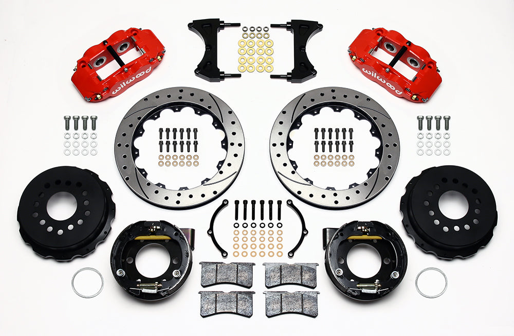 Forged Narrow Superlite 4R rear disc kits provide the ultimate Big Brake solution for popular muscle car rear axles that require a parking brake. FNSL4R four piston calipers, 13” or 14” two-piece rotors, and high performance BP-10 compound pads provide optimized and balanced braking to compliment front big brake upgrades on all types of custom, show and high performance street machines. The neatly hidden internal shoe system provides a clean installation with superior static holding power for parking. Optional caliper finishes and rotor designs allow builders to personalize the style and performance for every application.