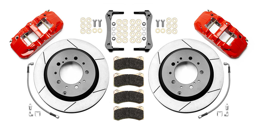 AERO4-DS Big Brake rear axle kits for 2008 to 2015 for Toyota Land Cruiser (J200) and Lexus ZLX570 replace the factory disc brakes and use the OE parking brake assembly as a compliment to front big brake upgrade kit. High capacity braking from the Aero4 Dust Boot calipers incorporate an exclusive dust wiper seal that further protects the piston bore from dust and corrosion. BP-20 compound pads, and oversized 14.50 in rotors are matched to the OE master cylinder output, ABS function, and individual vehicle bias requirements. Enhanced brake performance, increased durability, and high-tech style compliment big wheel, tire, and suspension upgrades on vehicles with increased brake requirements from high GVW. Kit comes complete with stainless braided flex lines.