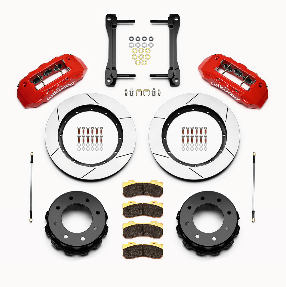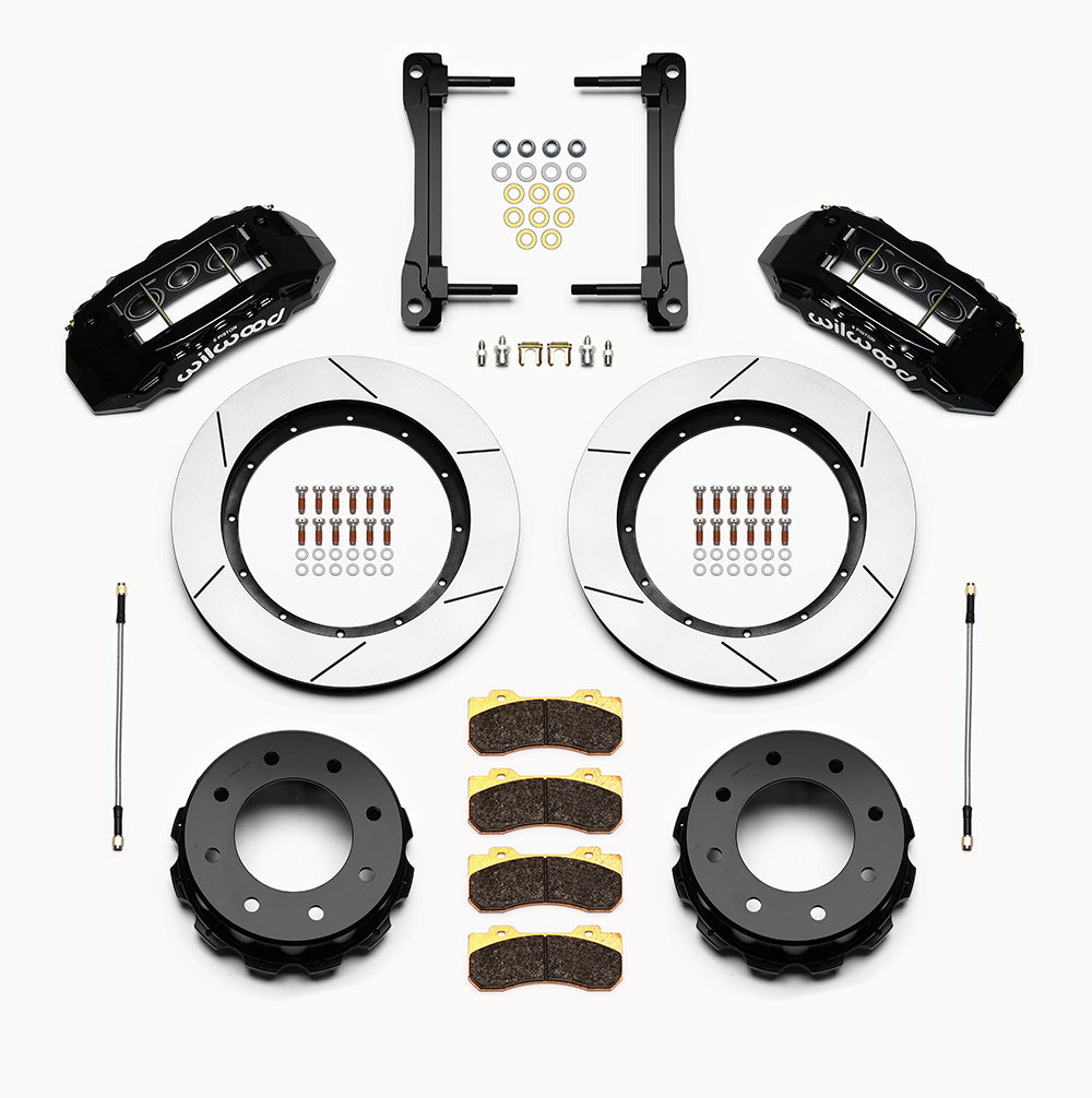 Wilwood's Tactical Extreme TX6R Big Brake rear kits are ultimate in braking performance for Truck, SUV and Armored Vehicles. Using TX6R radial mount six-piston calipers and massive 15.00” to 16.00” GT-60 directional vane Spec-37 alloy rotors, these kits deliver consistent stopping power and extreme duty durability under sustained high heat with this ready to bolt-on kit. The calipers are volume matched for compatibility with original equipment power brake system output. TX6R rear kits replace the factory disc brakes and use the OE parking brake assembly as a compliment to front big brake upgrades. Kits include radial mount caliper brackets, and all the necessary hardware to complete the installation. Braided stainless steel flex lines will need to be purchased for some applications.
