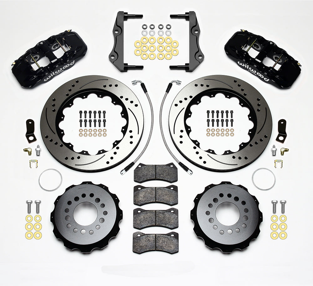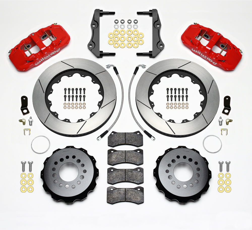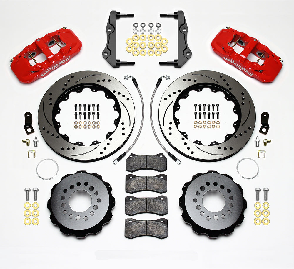 AERO4 Big Brake Rear Axle Kits replace the factory disc brakes and use the OE parking brake assembly as a compliment to front big brake upgrades on late model high performance vehicles. High capacity braking from the W4AR calipers, BP-10 compound pads, and oversized 14.00 in rotors are matched to the OE master cylinder output, ABS function, and individual vehicle bias requirements. Enhanced brake performance, increased durability, and high-tech style compliment big wheel, tire, and suspension upgrades on customized vehicles and all others with increased brake requirements.