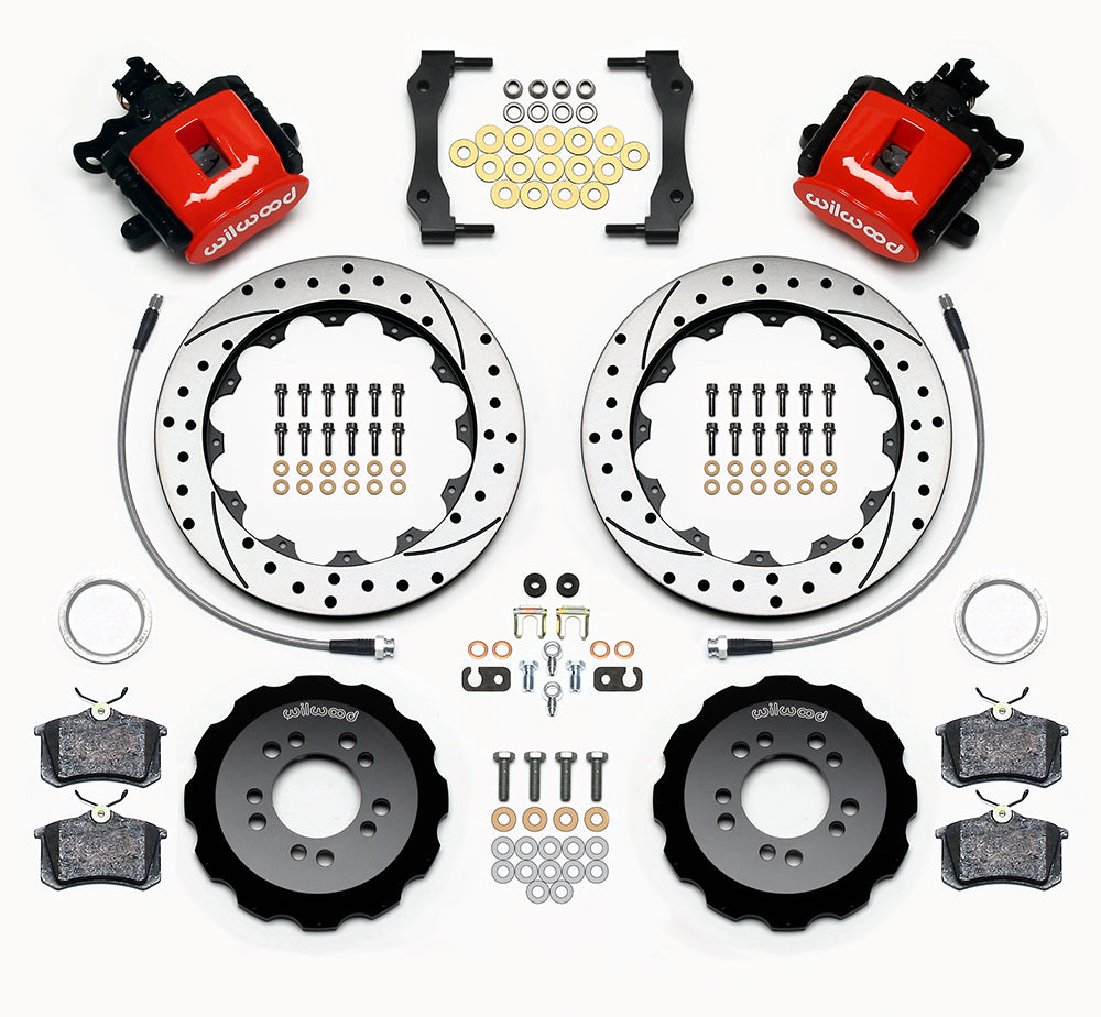 Combination hydro-mechanical Parking Brake calipers use hydraulic pressure from the master cylinder for stopping power, and an internal mechanical lock within the caliper for a parking brake. CPB kits are built primarily for front wheel drive vehicles, and select rear wheel drive axles that are not well suited for internal shoe style parking brakes. The calipers are coupled with oversized two-piece rotor assemblies with aluminum hats and high friction BP-10 compound pads. CPB kits provide the correct balanced brake performance and matching style to compliment front big brake upgrade kits.