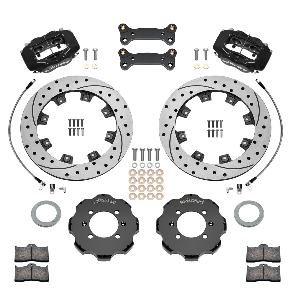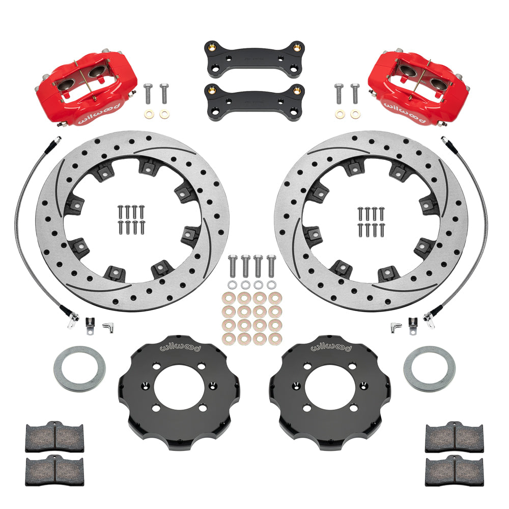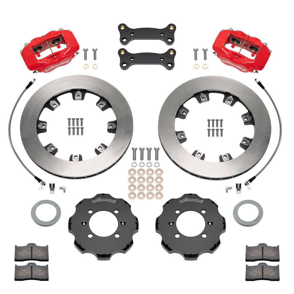 Forged Dynalite ProSeries kits provide high performance, big brake stopping power by combining modern brake technology with high-tech styling to update the brakes on your compact sport vehicle. The OE calipers and rotors are replaced with forged aluminum, four-piston calipers mounted over larger diameter, certified alloy 30-vane vented iron rotors. The new two-piece rotor assemblies provide weight-saving forged aluminum mounting hats. The calipers feature an increase in effective piston volume to deliver higher clamping power with less pedal effort than stock. The thicker, vented rotor design adds cooling efficiency and durability to extend service life. BP-series SmartPads add high-response with increased resistance to fade and longer wear over typical OE replacement pads. Options for caliper colors and rotor styles are available to personalize the look on any car. For on-track driving enthusiasts, additional track-only fortifications are available on a custom order basis by contacting the technical staff at the factory.