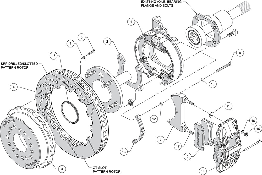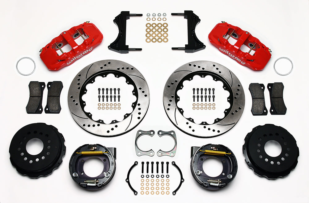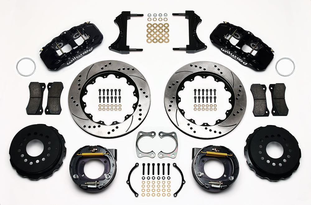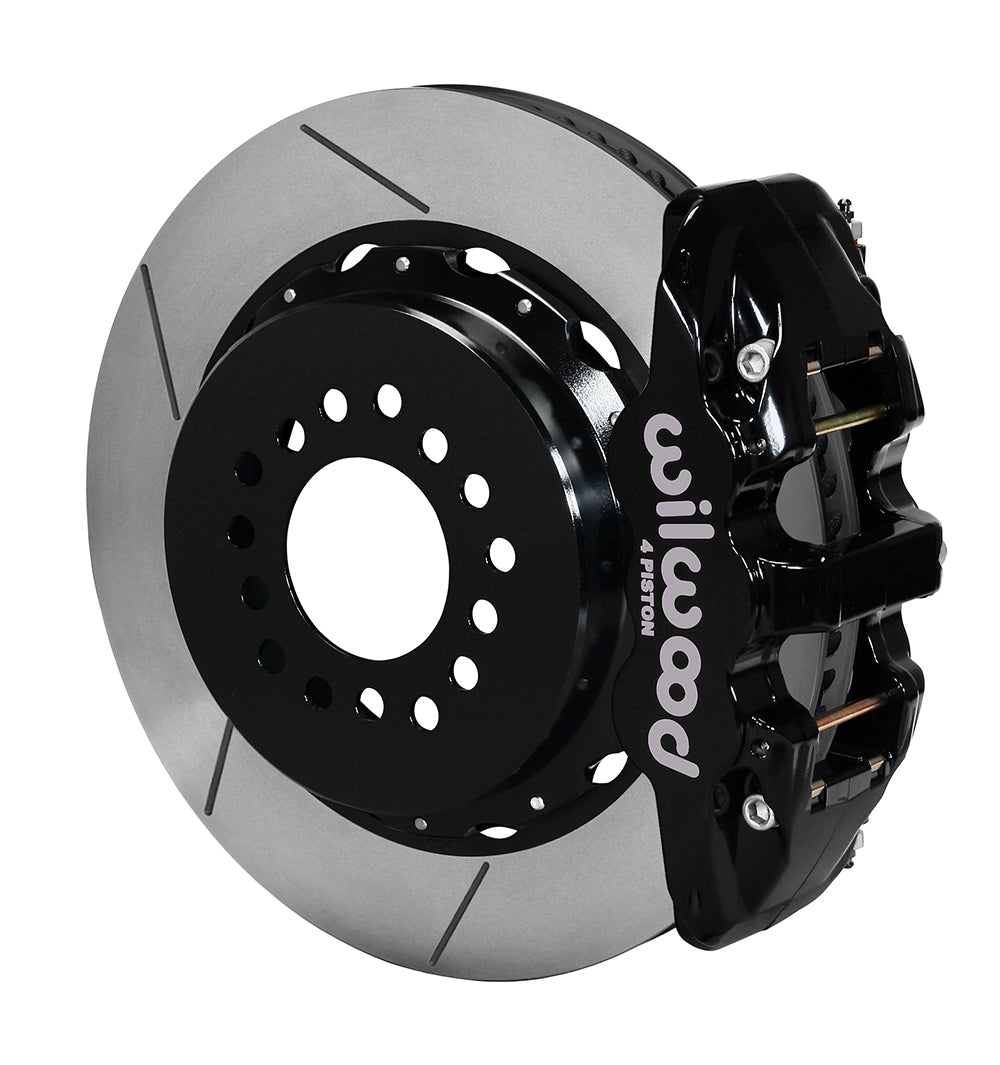 AERO4 Big Brake Rear Axle Kits replace the factory disc brakes and use the OE parking brake assembly as a compliment to front big brake upgrades on late model high performance vehicles. High capacity braking from the AERO4 radial mount calipers, High friction BP compound pads, and oversized 14.00 in rotors are matched to the OE master cylinder output, ABS function, and individual vehicle bias requirements. Enhanced brake performance, increased durability, and high-tech style compliment big wheel, tire, and suspension upgrades on customized vehicles and all others with increased brake requirements.