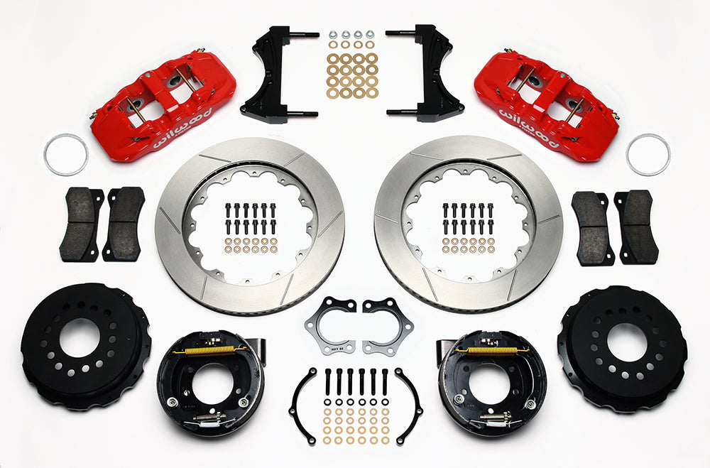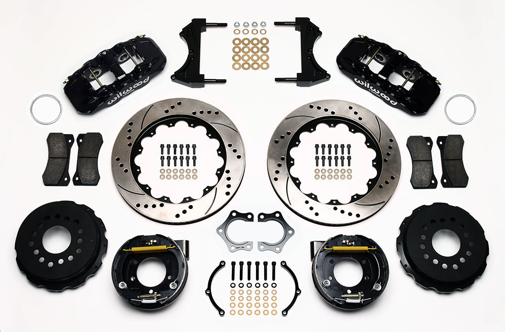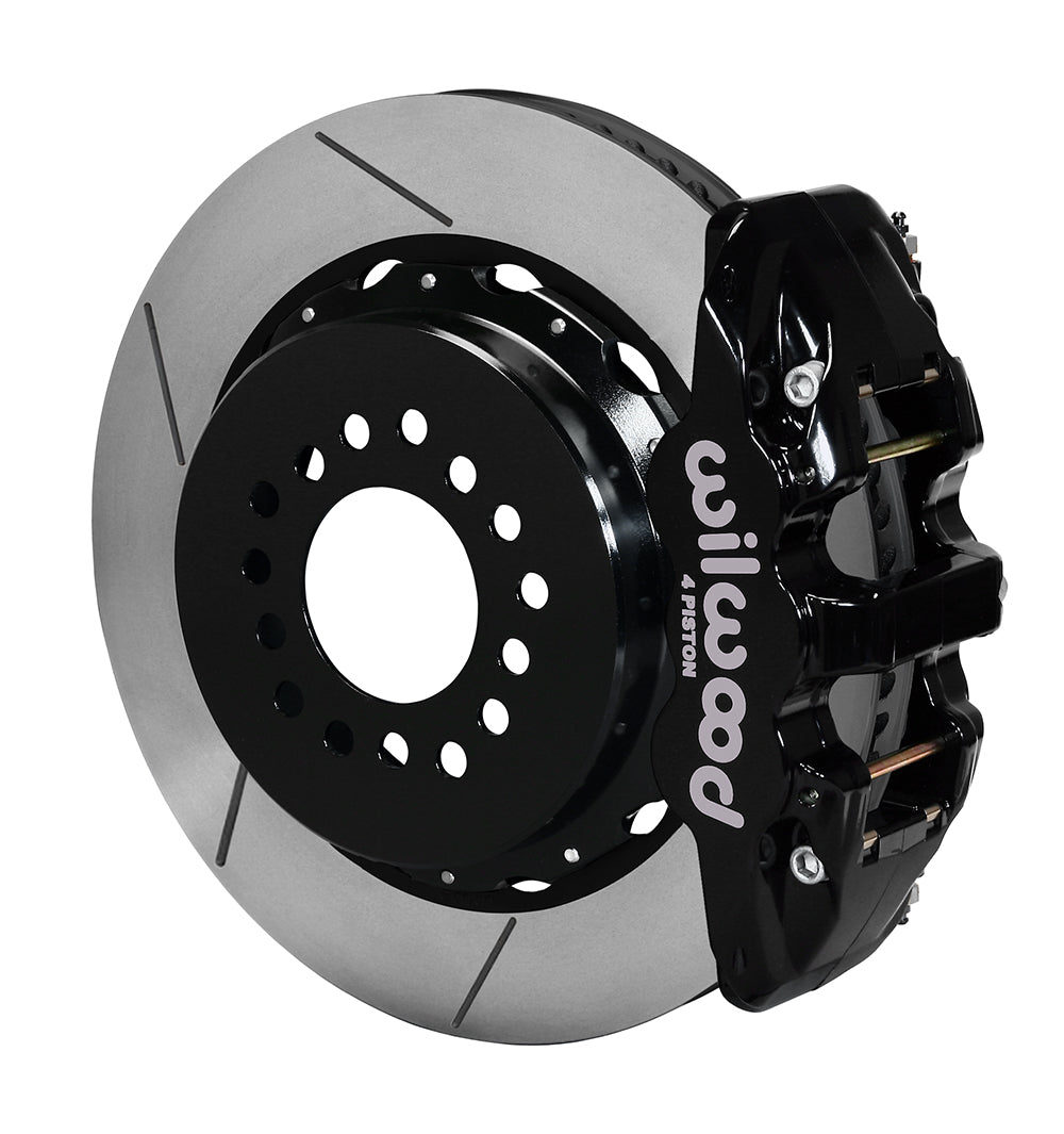 AERO4 Big Brake Rear Axle Kits replace the factory disc brakes and use the OE parking brake assembly as a compliment to front big brake upgrades on late model high performance vehicles. High capacity braking from the AERO4 radial mount calipers, High friction BP compound pads, and oversized 14.00 in rotors are matched to the OE master cylinder output, ABS function, and individual vehicle bias requirements. Enhanced brake performance, increased durability, and high-tech style compliment big wheel, tire, and suspension upgrades on customized vehicles and all others with increased brake requirements.