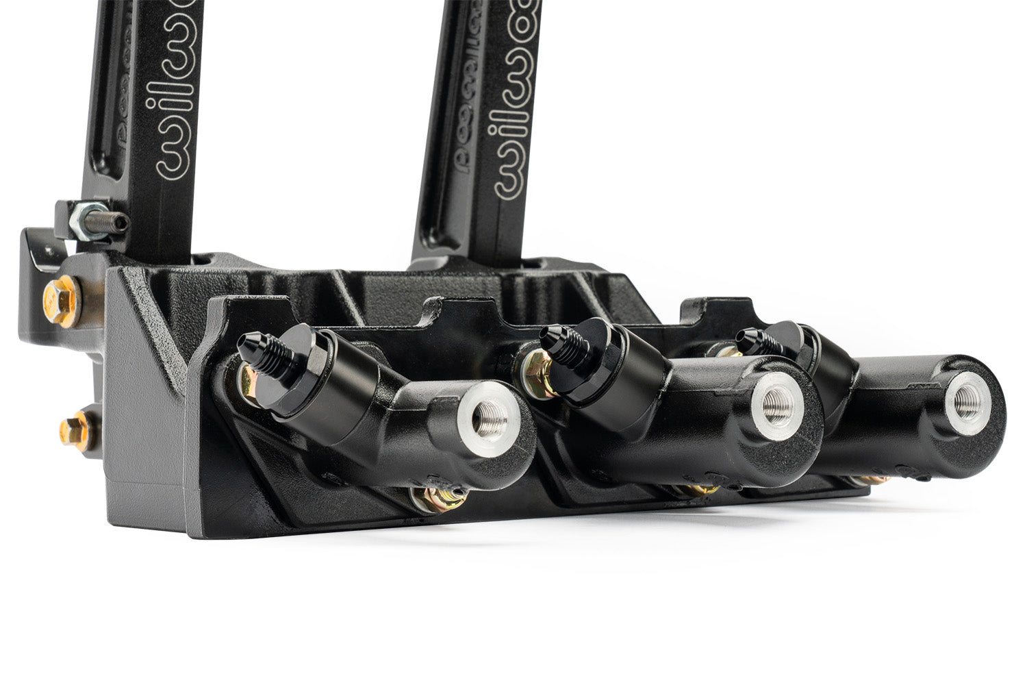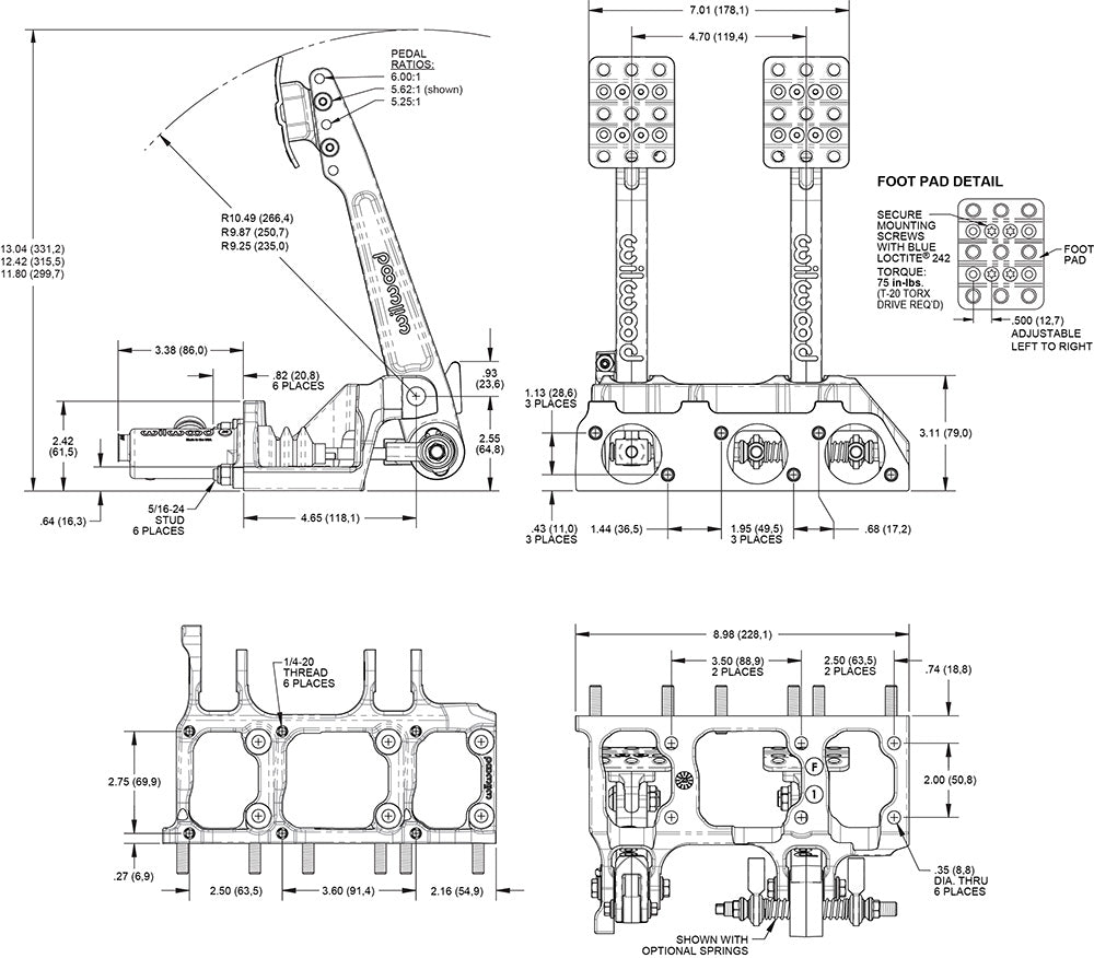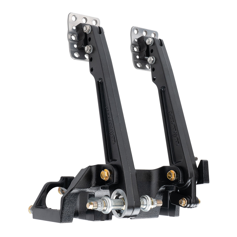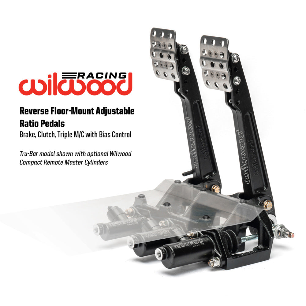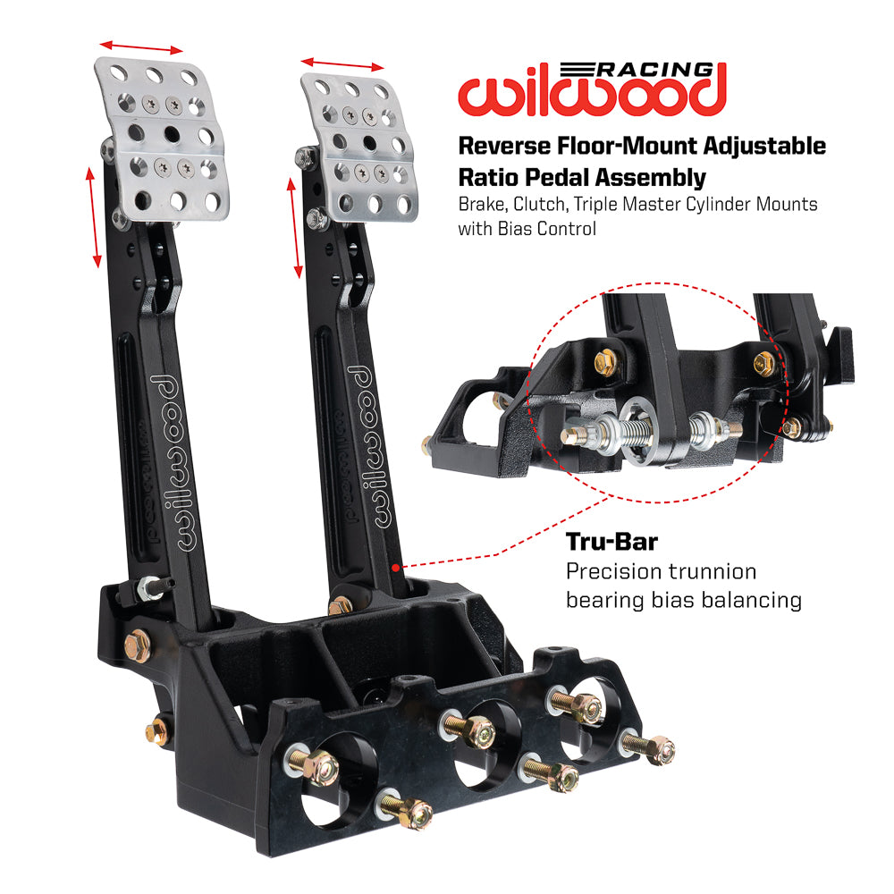 Adjustable ratio Tru-Bar brake pedal, in a floor mount brake and clutch pedal assembly. Pedal head adjusts vertically to provide a 5.25, or 6.00:1 ratio for more feel or less pedal effort. A clutch and two brake master cylinders mount to the assembly, with a friction-free, trunnion based adjustable Tru-Bar balance bar providing front to rear brake bias fine tuning. The non-skid waffled pedal pads can be laterally adjusted to be from 3.75 to 5.75 inches on center for driver preference. The pedals feature a lightweight aluminum frame, with high strength reinforced I-beam style forged pedal arms. The Tru-Bar incorporates a positive detent stop every full turn to maintain adjustment position and can be locked in place with the included jam nut, or used with an optional remote knob for quick on-track adjustments. Tru-Bar pedals utilize a fixed trunnion bearing in the pedal arm, with spherical rod-end bearing pushrod attachments reducing compliance and friction for more accurate brake feel. Tru-Bar pedals utilize the same chassis and master cylinder mounting as Wilwood balance bar style pedals. This pedal accepts three Wilwood 2.25-inch vertical mount flange, remote inlet, single outlet master cylinders, available separately in a variety of styles and bore sizes.