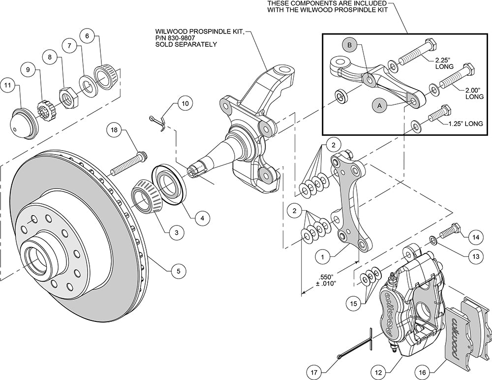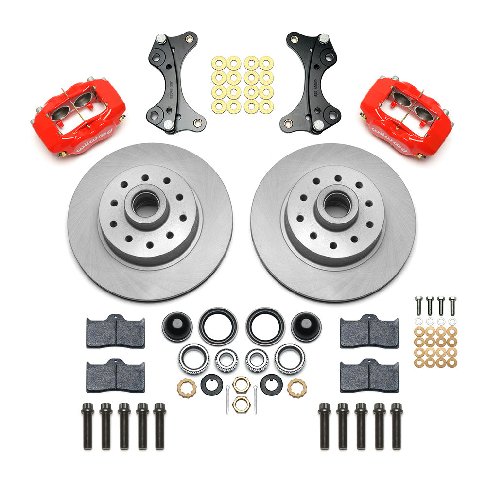 Wilwood's Classic Series front disc brake kits offer an economical braking solution for Wilwood Pro Spindles. A completely new kit design, featuring a large 11.03 in x 0.88” rotor and hub assembly. Now upgraded with a new design dual bolt pattern rotor with screw in ½-20 studs, providing both a 5 x 4.50” and 5 x 4.75” wheel bolt circle options. Classic Series kits are based on the venerable forged billet Dynalite caliper, these versatile kits are easily optioned to suit the braking requirements and style preferences for a daily driver or the most discriminating show enthusiast. Intended vehicle applications require no modifications for installation, and provide plenty of clearance inside popular 15 in wheels. FDL 1 piece kits can be used with either manual or power boost master cylinders. Kits are complete with calipers, rotors and, hub assembly brackets and hardware. Kit requires purchase of additional brake line kit.