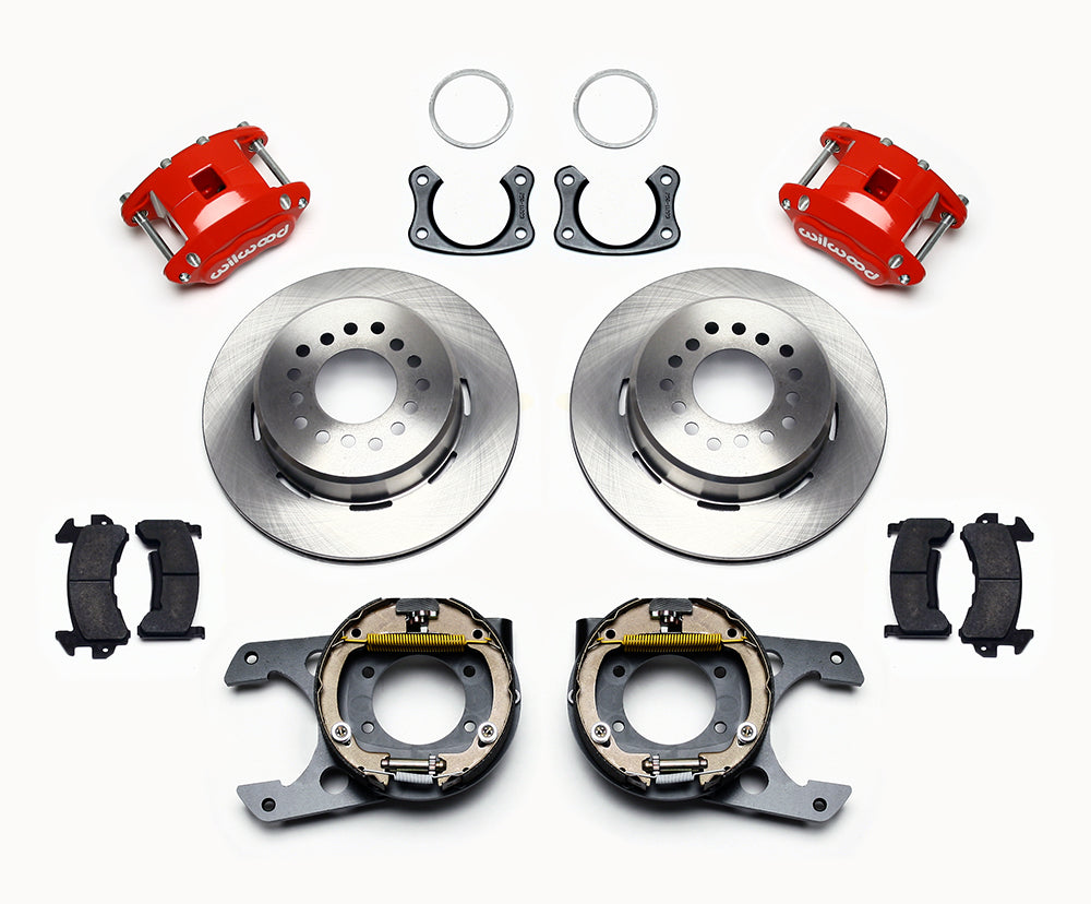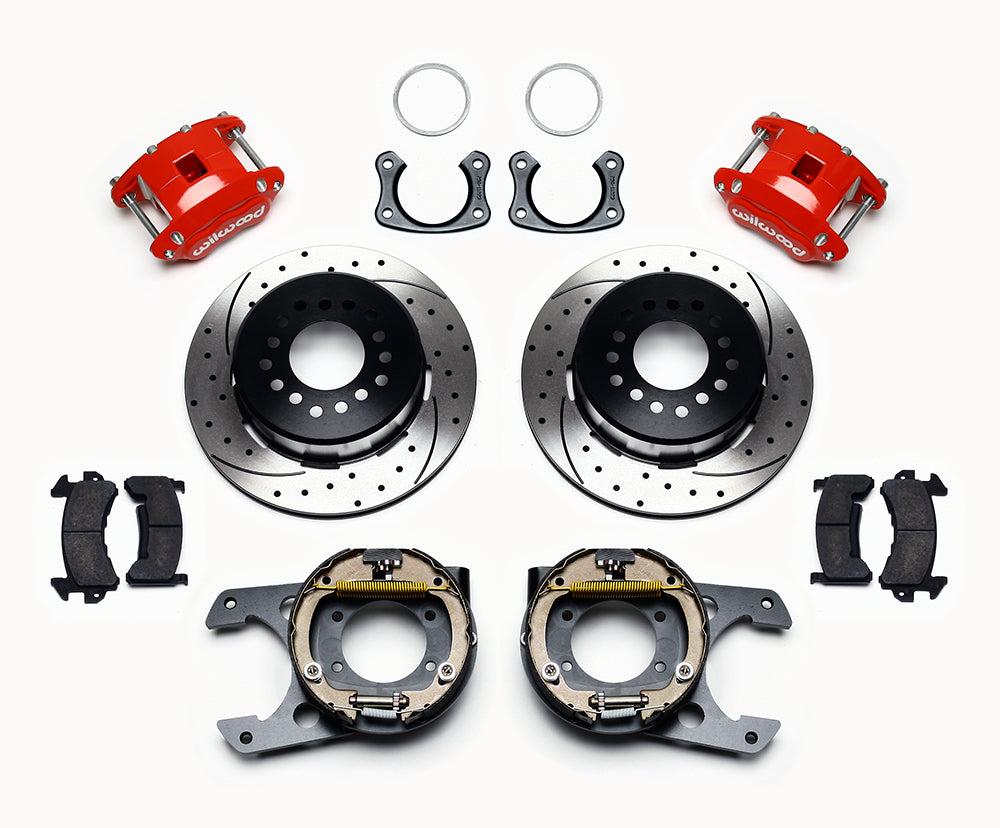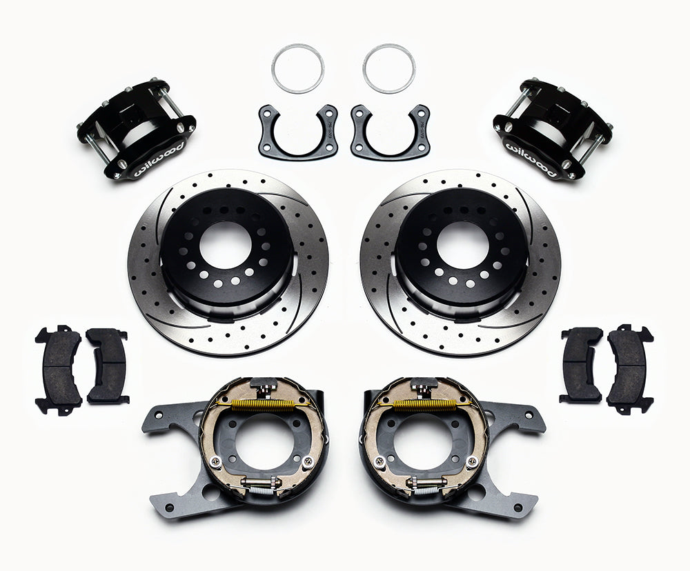 D154 Pro-Series rear disc kits provides a complete solution for popular muscle car rear axles that require a parking brake. Forged D154 dual piston calipers, 12.19” one-piece drum/rotors, and high friction pads provide optimized and balanced braking for all types of custom performance street/strip and show machines. The neatly hidden internal shoe system provides a clean installation with superior static holding power for parking. D154 rear caliper kits offer a complimentary match to vehicles using Wilwood D52 or D154 calipers on OE spindles. Optional caliper finishes and rotor designs enable the builder to personalize the style and optimize brake performance.