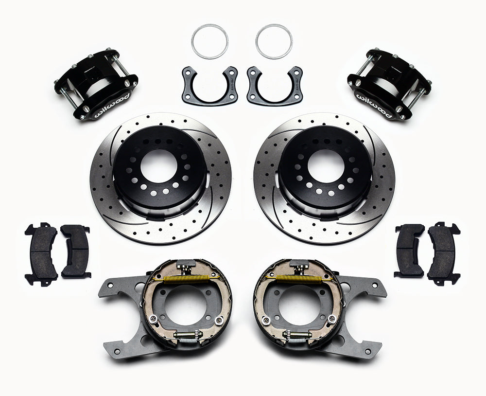 D154 Pro-Series rear disc kits provides a complete solution for popular muscle car rear axles that require a parking brake. Forged D154 dual piston calipers, 12.19” one-piece drum/rotors, and high friction pads provide optimized and balanced braking for all types of custom performance street/strip and show machines. The neatly hidden internal shoe system provides a clean installation with superior static holding power for parking. D154 rear caliper kits offer a complimentary match to vehicles using Wilwood D52 or D154 calipers on OE spindles. Optional caliper finishes and rotor designs enable the builder to personalize the style and optimize brake performance.