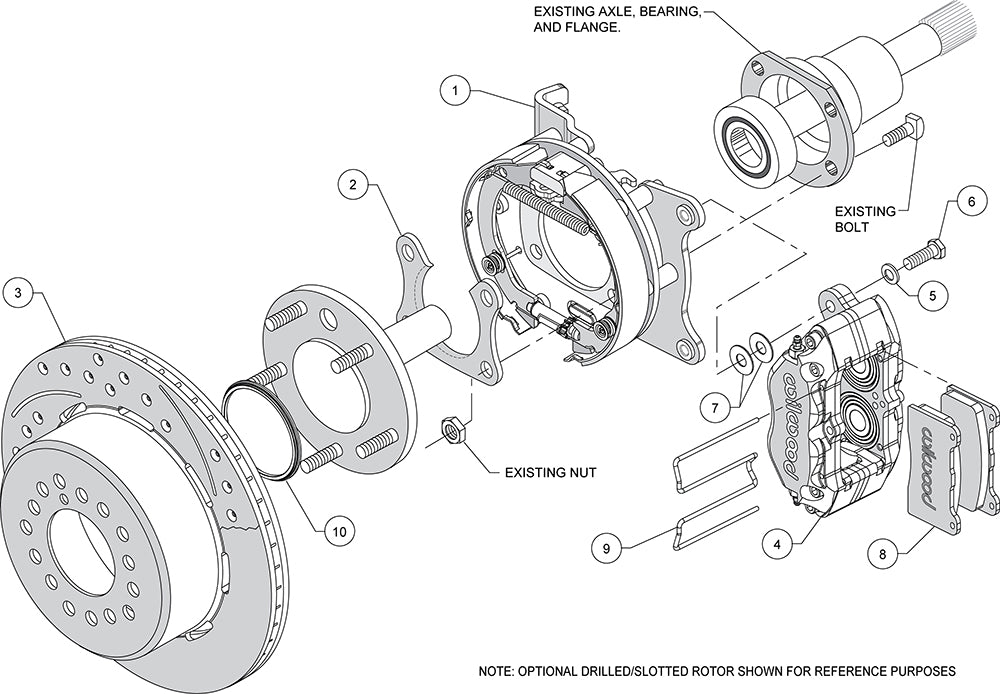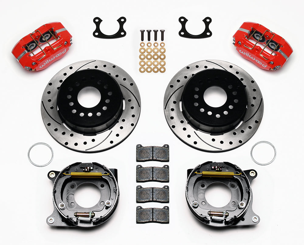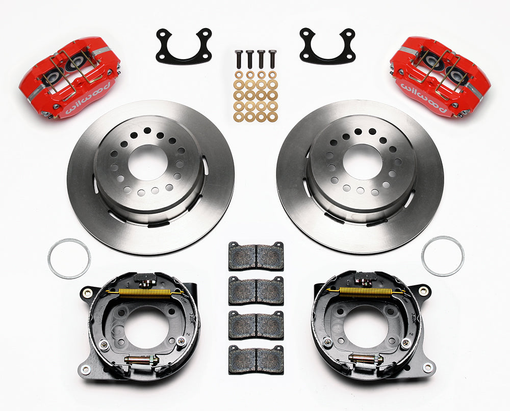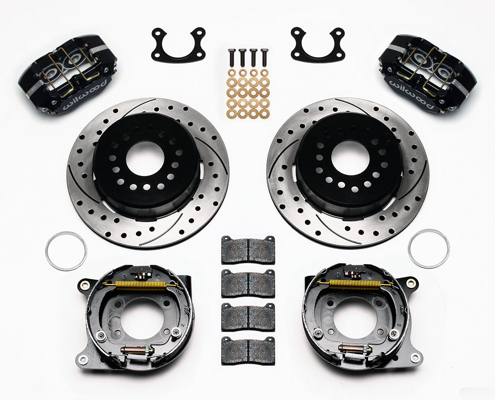 DP-DB Pro-Series rear disc kits provide a complete solution for popular muscle car rear axles that require a parking brake. Dynapro Dustboot calipers, 12.19” one-piece drum/rotors, and high friction pads provide optimized and balanced braking for all types of custom performance street/strip and show machines. These kits were developed for applications or locations that require or prefer a dust-sealed piston. Dust-boot sealed aluminum pistons provide added protection against road or track born dirt and debris on low to intermediate temperature range applications that may also operate in harsh environments. The neatly hidden internal shoe system provides a clean installation with superior static holding power for parking. Optional caliper finishes and rotor designs enable the builder to personalize the style and optimize brake performance for every individual application.