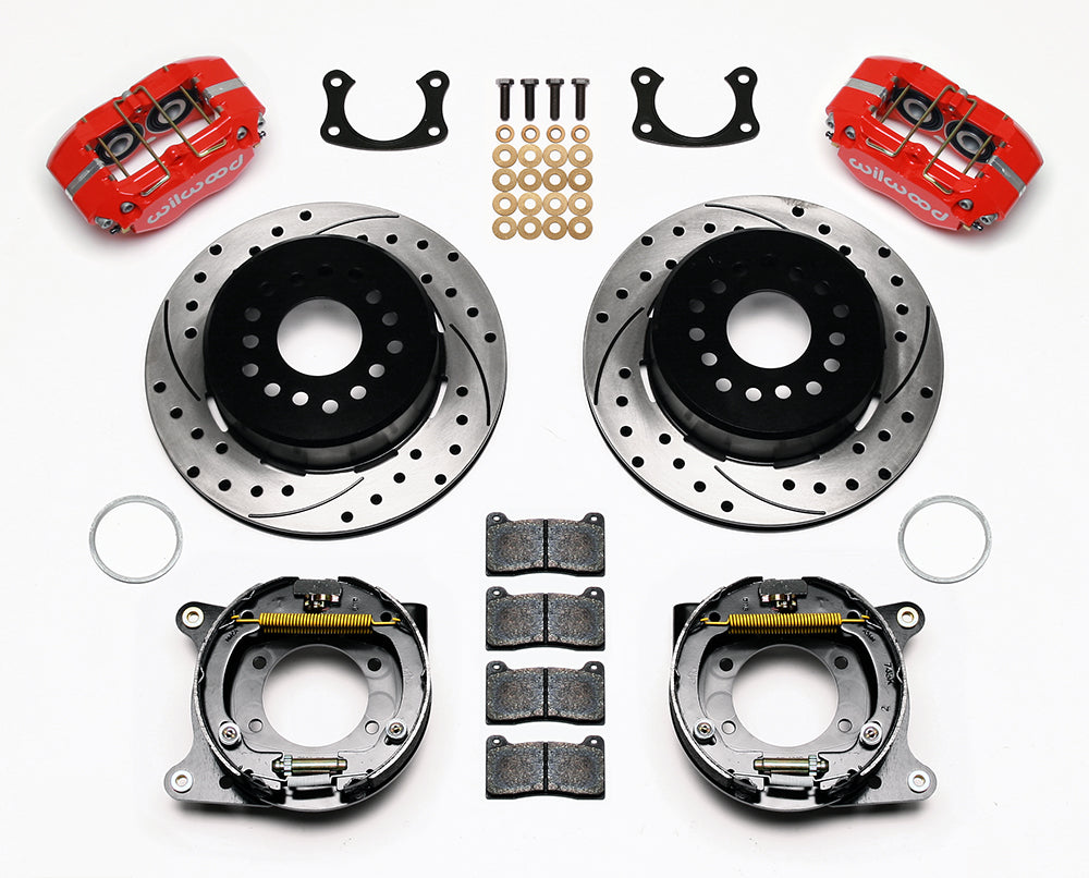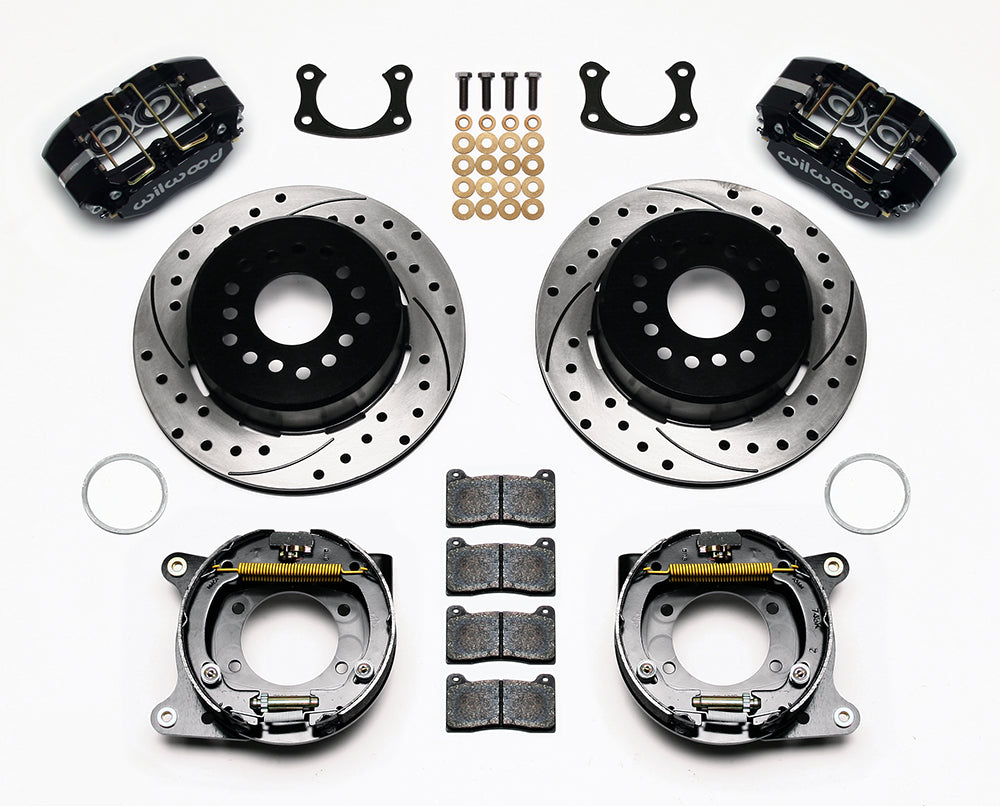 DP-DB Pro-Series rear disc kits provide a complete solution for popular muscle car rear axles that require a parking brake. Dynapro Dustboot calipers, 12.19” one-piece drum/rotors, and high friction pads provide optimized and balanced braking for all types of custom performance street/strip and show machines. These kits were developed for applications or locations that require or prefer a dust-sealed piston. Dust-boot sealed aluminum pistons provide added protection against road or track born dirt and debris on low to intermediate temperature range applications that may also operate in harsh environments. The neatly hidden internal shoe system provides a clean installation with superior static holding power for parking. Optional caliper finishes and rotor designs enable the builder to personalize the style and optimize brake performance for every individual application.