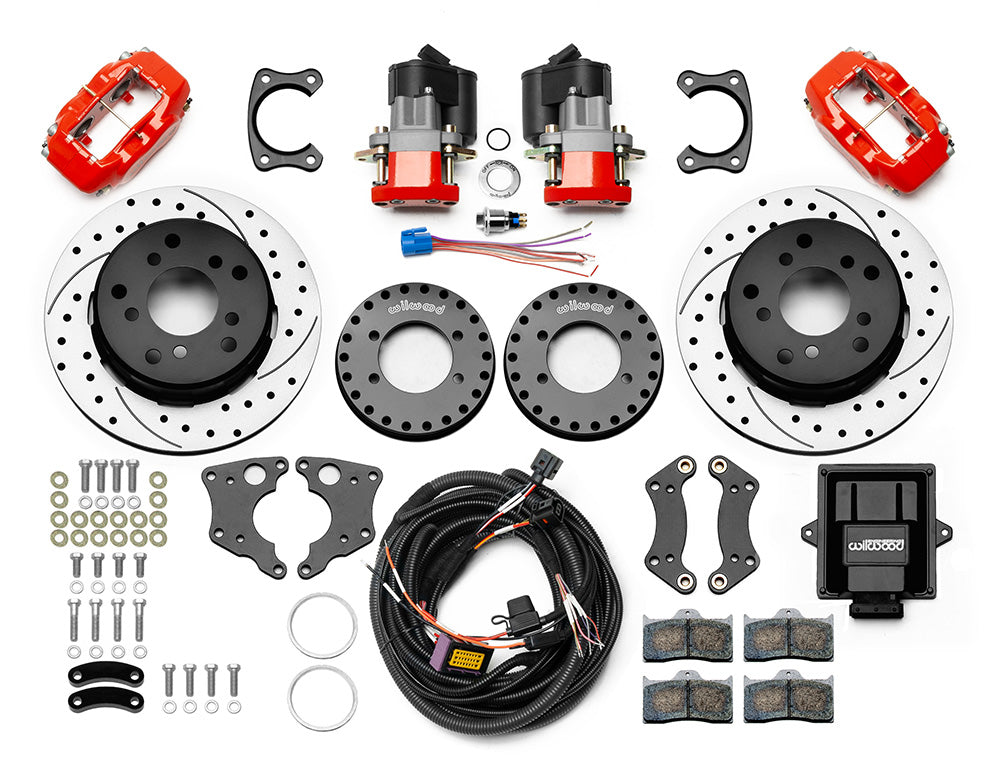 These FDL Pro-Series Rear EPB (Electric Parking Brake) Kits provide an innovative parking brake solution for popular car and truck rear axles. Forged billet aluminum Dynalite four piston calipers, 12.19” one-piece rotors, and high-friction pads provide balanced front/rear brake bias for all types of high-performance street machines. The unique EPB caliper provides secure parking with high-torque holding power, but simplifies installation with no mechanical cable connection needed. Comes complete with switch, indicator, control unit and harness assembly.