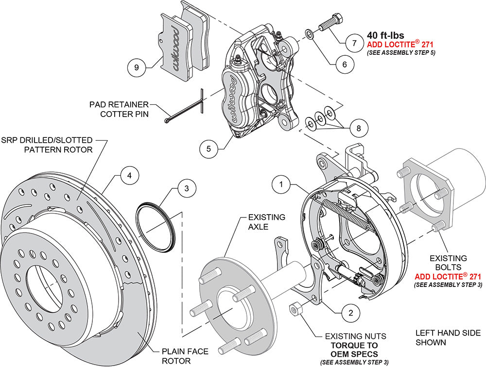This group of FDL Pro-Series rear disc kits provides a complete solution for popular muscle car rear axles that require a parking brake. Forged billet Dynalite four piston calipers, 12.19” one-piece drum/rotors, and high friction pads provide optimized and balanced braking for all types of custom performance street/strip and show machines. The neatly hidden internal shoe system provides a clean installation with superior static holding power for parking. Optional caliper finishes and rotor designs enable the builder to personalize the style and optimize brake performance for every individual application.