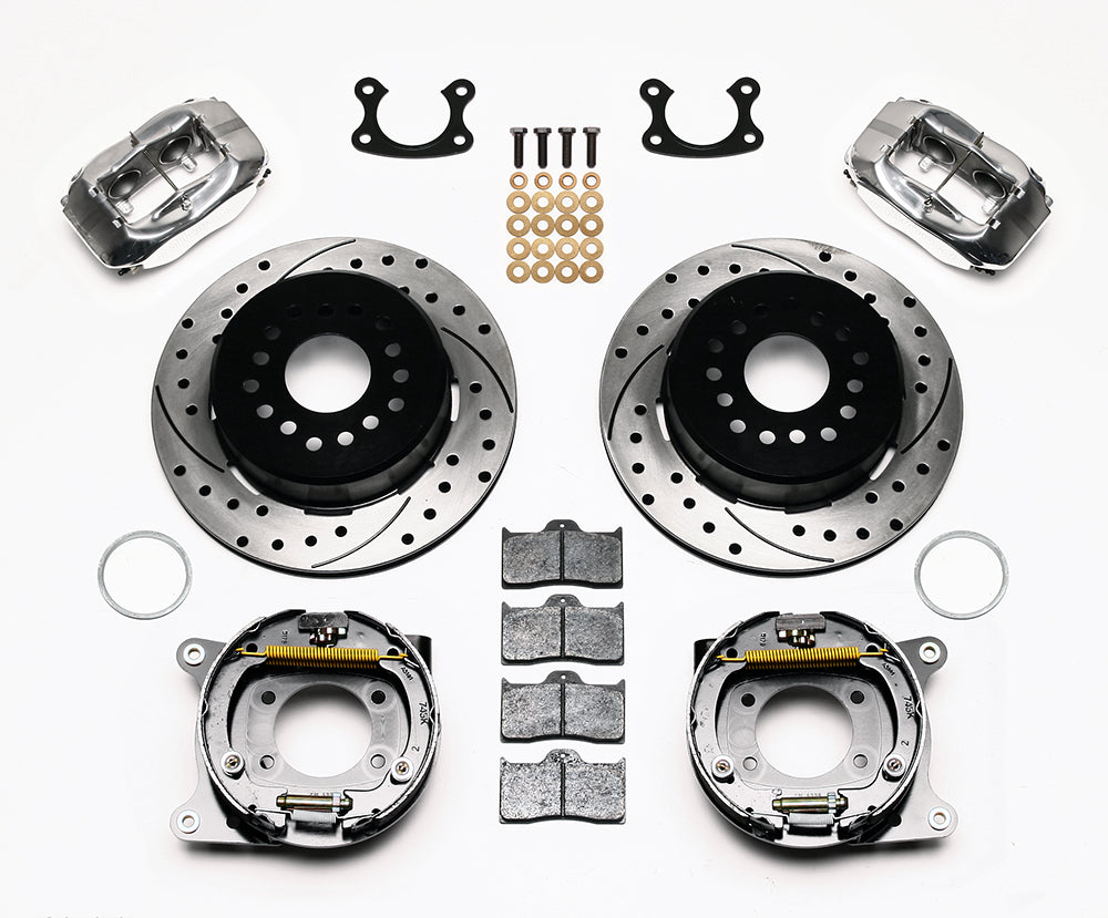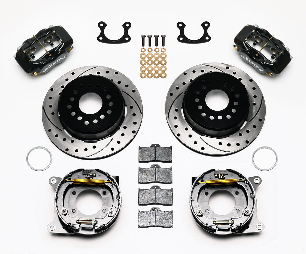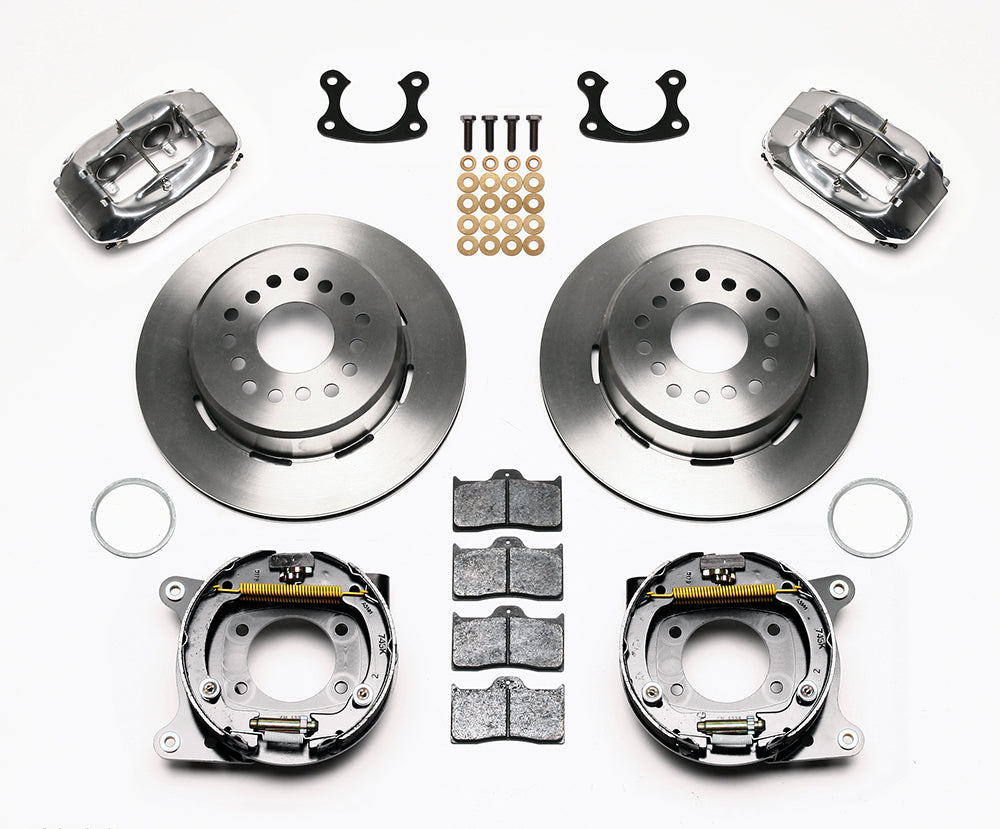 This group of FDL Pro-Series rear disc kits provides a complete solution for popular muscle car rear axles that require a parking brake. Forged billet Dynalite four piston calipers, 12.19” one-piece drum/rotors, and high friction pads provide optimized and balanced braking for all types of custom performance street/strip and show machines. The neatly hidden internal shoe system provides a clean installation with superior static holding power for parking. Optional caliper finishes and rotor designs enable the builder to personalize the style and optimize brake performance for every individual application.