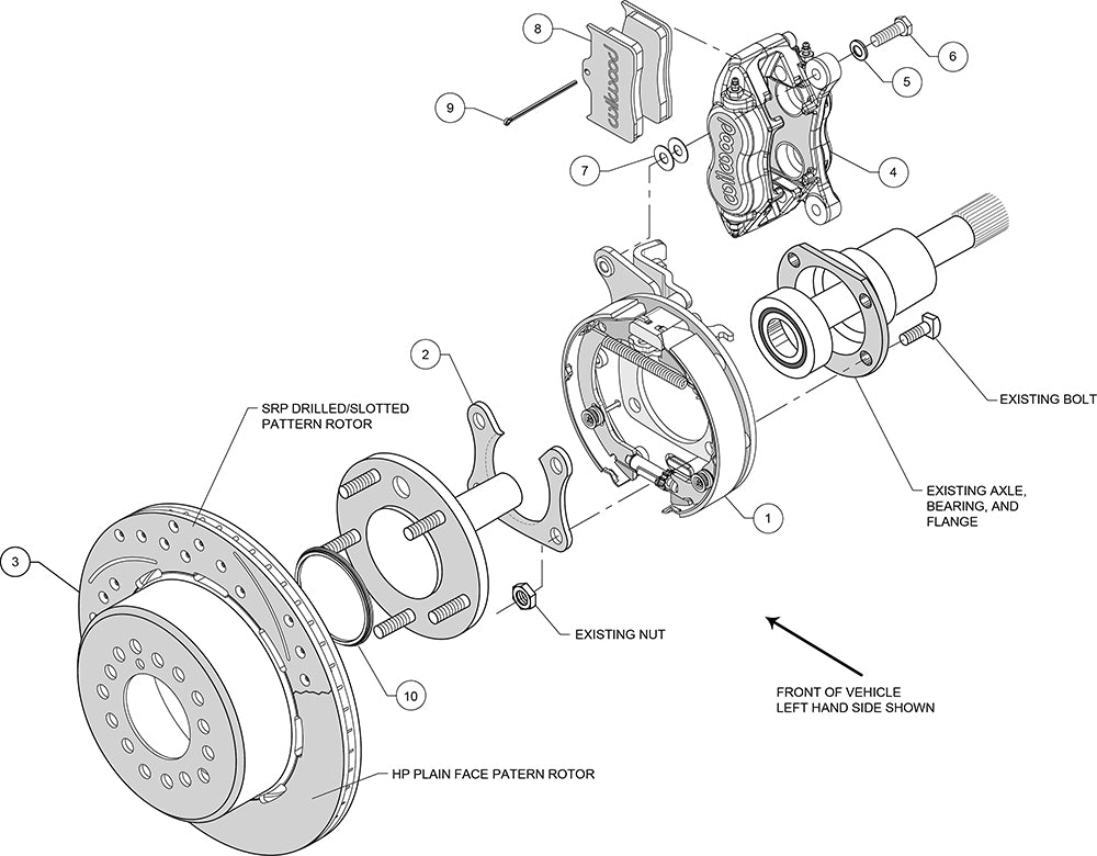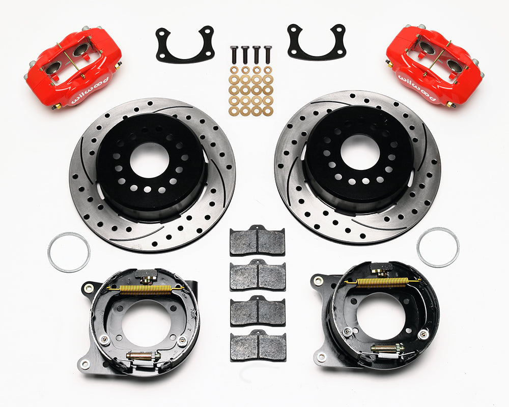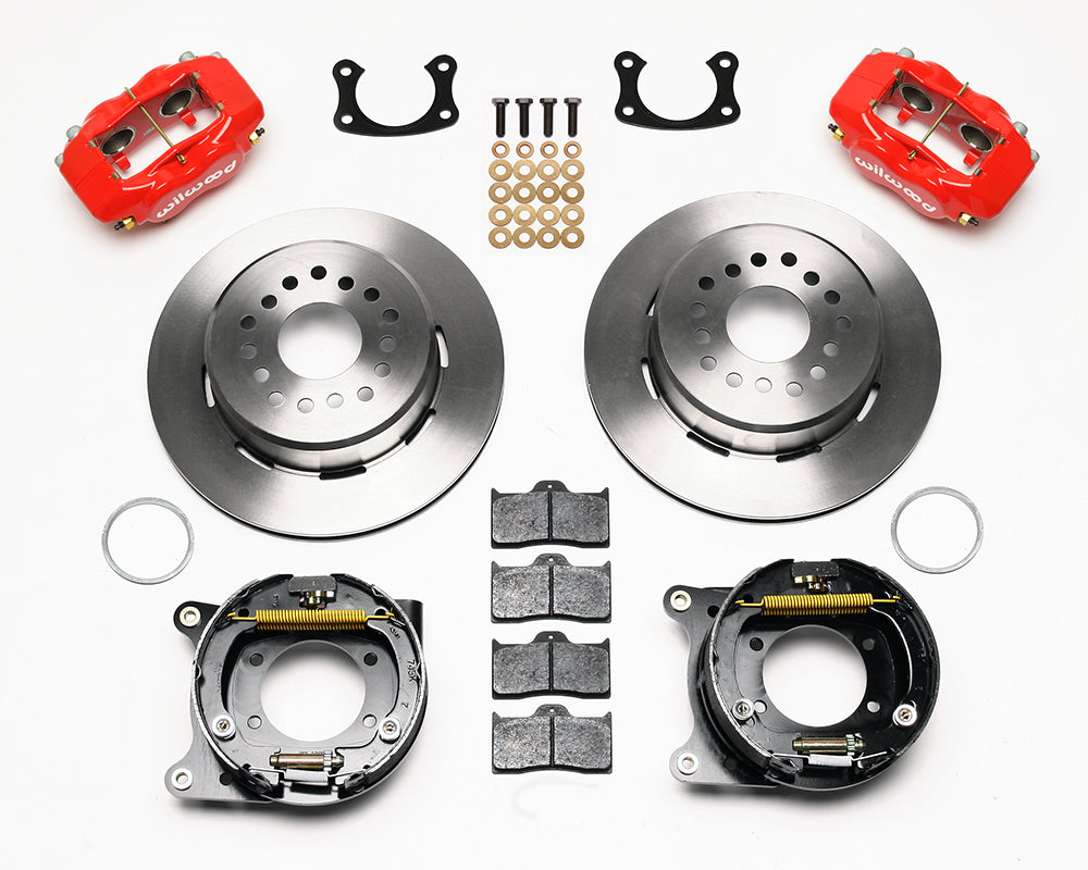 This group of FDL Pro-Series rear disc kits provides a complete solution for popular muscle car rear axles that require a parking brake. Forged billet Dynalite four piston calipers, 12.19” one-piece drum/rotors, and high friction pads provide optimized and balanced braking for all types of custom performance street/strip and show machines. The neatly hidden internal shoe system provides a clean installation with superior static holding power for parking. Optional caliper finishes and rotor designs enable the builder to personalize the style and optimize brake performance for every individual application.