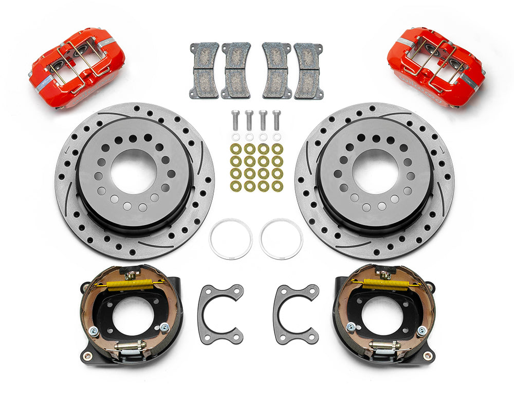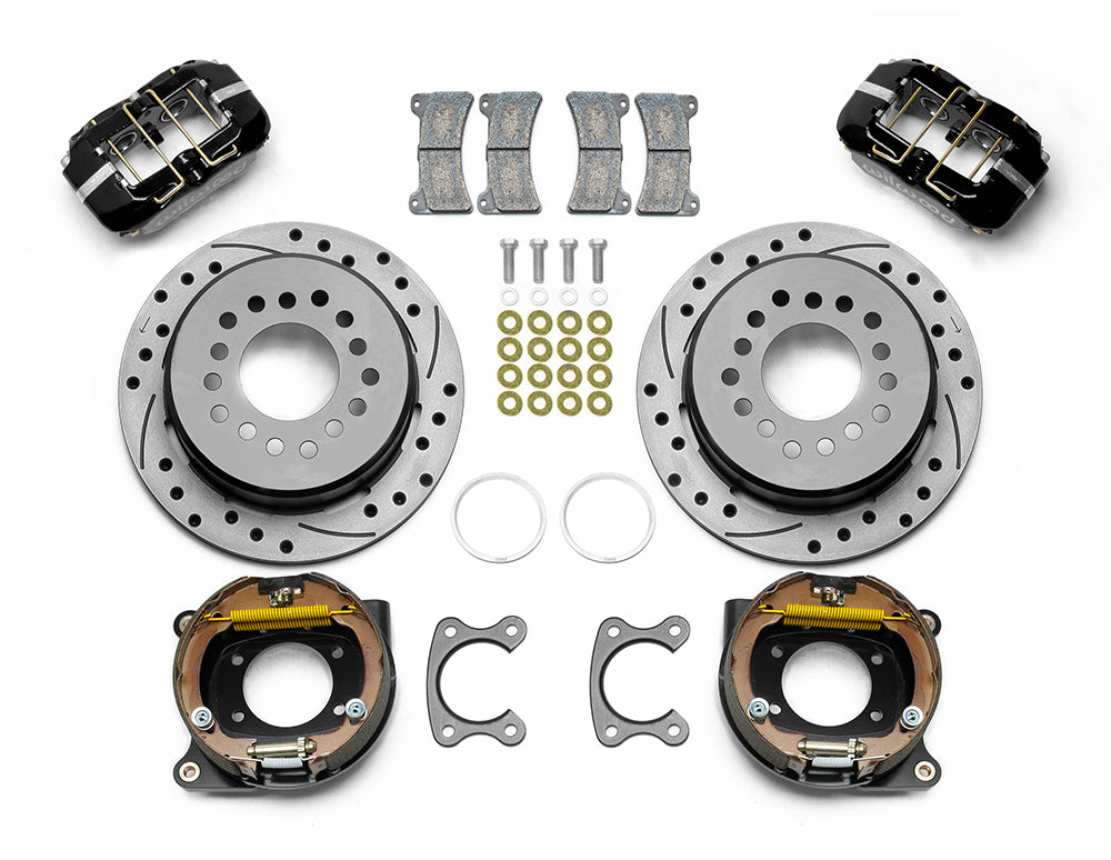 Forged Dynapro Low-Profile Dust Seal Pro-Series rear disc brake kits provide a complete solution for popular muscle car rear axles on applications that require a parking brake assembly and extra clearance for 14.00” to 15.00” rim applications. Forged billet Dynapro Low-Profile four-piston calipers with dust seals, 11.00” one-piece hat and rotor assemblies, and high friction pads provide optimized and balanced braking for all types of custom performance street/strip and show machines. The neatly hidden internal shoe system provides a clean installation with superior static holding power for parking. Optional caliper finishes and rotor designs enable the builder to personalize the style and optimize brake performance for every individual application.