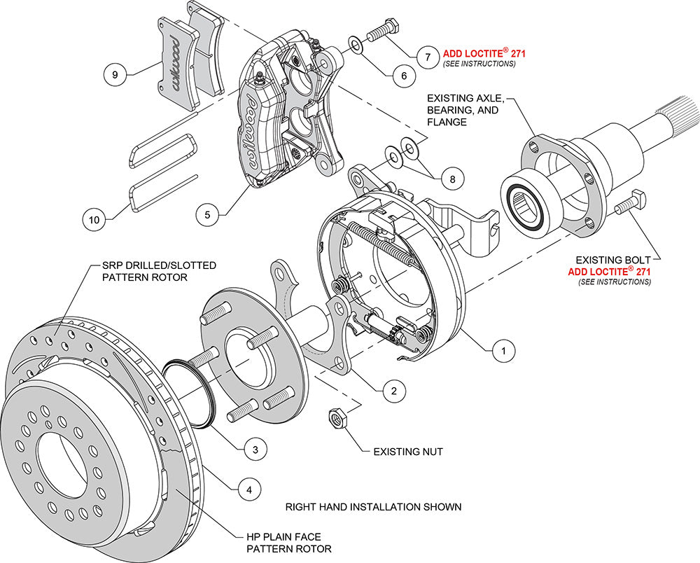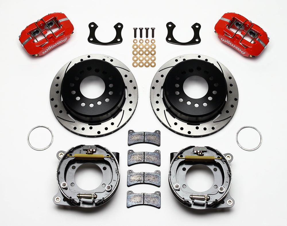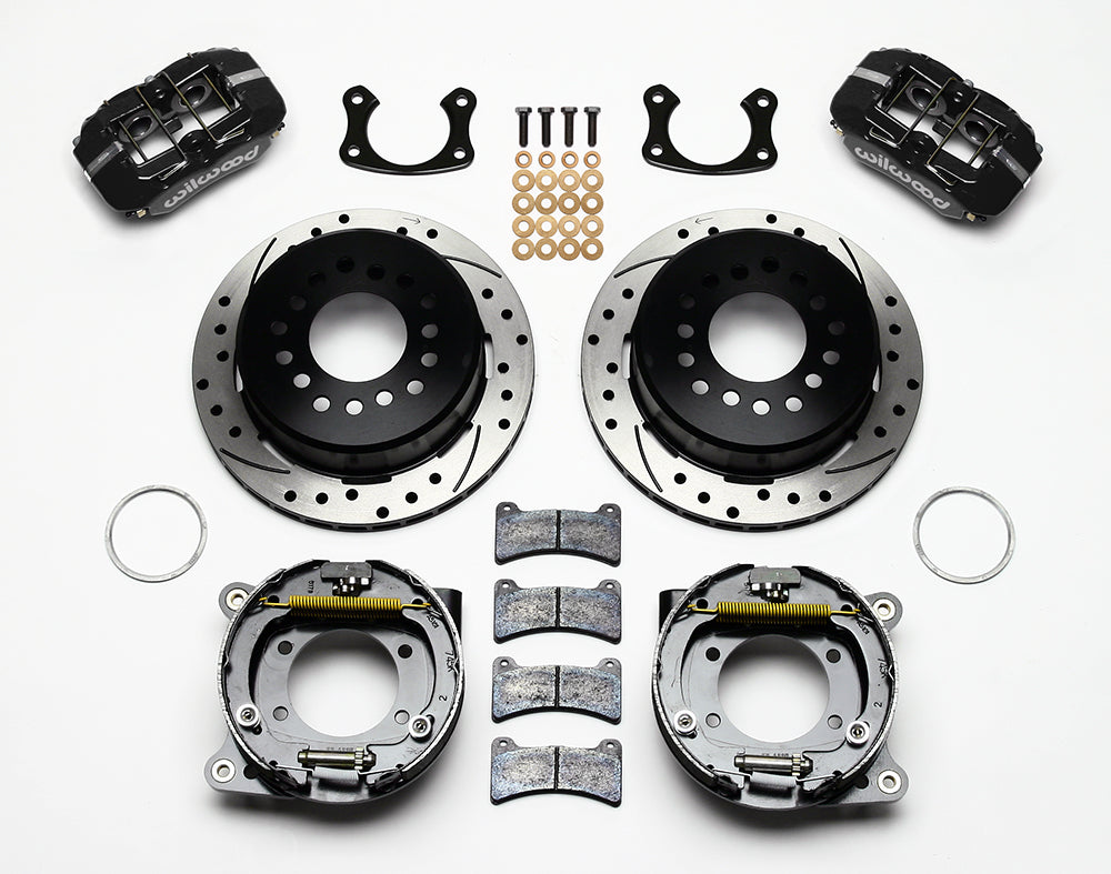 Forged Dynapro Low-Profile Pro-Series rear disc brake kits provide a complete solution for popular muscle car rear axles on applications that require a parking brake assembly and extra clearance for 14.00” to 15.00” rim applications. Forged billet Dynapro Low-Profile four-piston calipers 11.00” one-piece hat and rotor assemblies, and high friction pads provide optimized and balanced braking for all types of custom performance street/strip and show machines. The neatly hidden internal shoe system provides a clean installation with superior static holding power for parking. Optional caliper finishes and rotor designs enable the builder to personalize the style and optimize brake performance for every individual application.