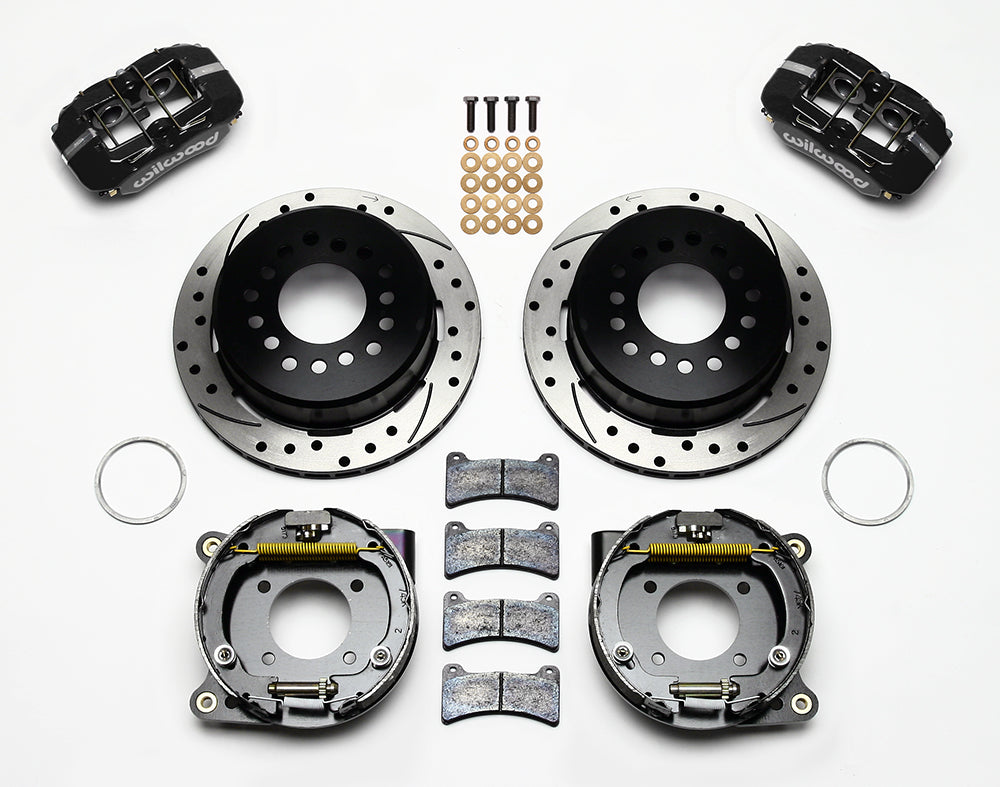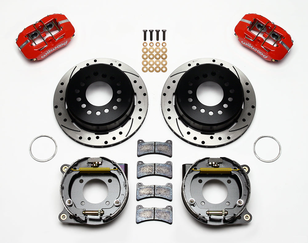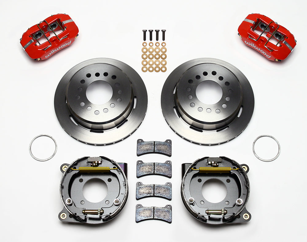 Forged Dynapro Low-Profile Pro-Series rear disc brake kits provide a complete solution for popular muscle car rear axles on applications that require a parking brake assembly and extra clearance for 14.00” to 15.00” rim applications. Forged billet Dynapro Low-Profile four-piston calipers 11.00” one-piece hat and rotor assemblies, and high friction pads provide optimized and balanced braking for all types of custom performance street/strip and show machines. The neatly hidden internal shoe system provides a clean installation with superior static holding power for parking. Optional caliper finishes and rotor designs enable the builder to personalize the style and optimize brake performance for every individual application.