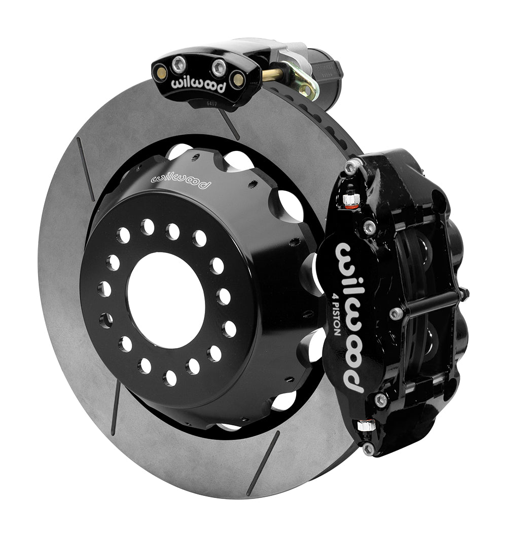 Forged Narrow Superlite 4R Rear Electronic Parking Brake Kits provide the ultimate Big Brake solution for popular muscle car rear axles that require a parking brake. FNSL4R four piston calipers, 13” or 14” two-piece rotors, and high performance BP-10 compound pads provide optimized and balanced braking to compliment front big brake upgrades on all types of custom, show and high performance street machines. The unique Electronic Parking Brake caliper provides a static high torque static holding power for parking without mechanical cabling. Supplied with control unit and harness assembly, it simplifies installation and use. Optional caliper finishes and rotor designs enable the builder to personalize the style and optimize brake performance for every individual application.