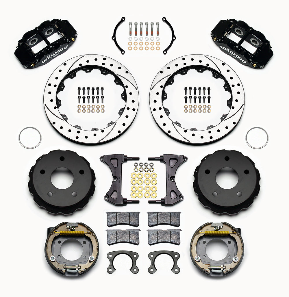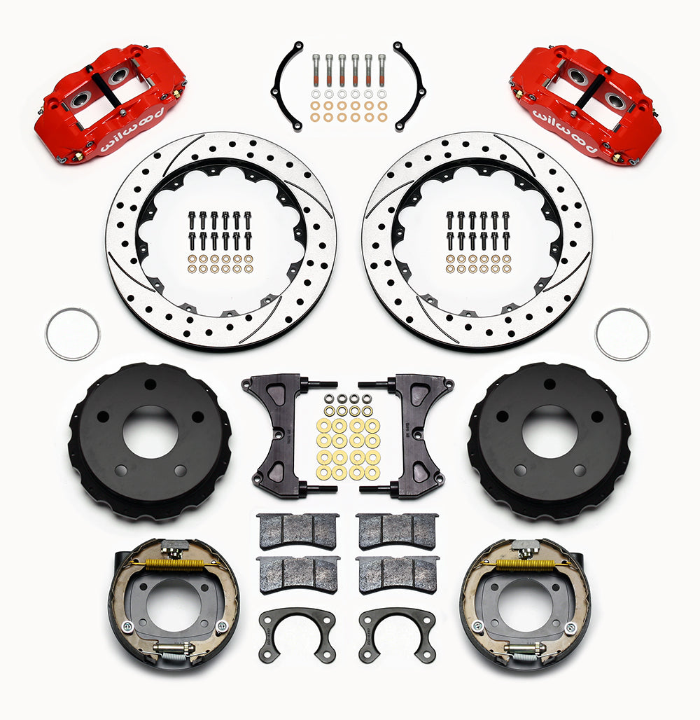 These versions of Forged Narrow Superlite 4R rear disc kits provide the ultimate Big Brake solution for Bronco 65-75 rear axles with Small Ford flange and bearing. (normally: OE 10 inch diameter brakes and 2700 or 2900 GVW.) Each includes a high efficiency drum style parking brake assembly. FNSL4R four piston calipers, 13” or 14” two-piece rotors, and high performance BP-10 compound pads provide optimized and balanced braking to compliment front big brake upgrades available for Bronco platform. The neatly hidden internal shoe system provides a clean installation with superior static holding power for parking. Optional caliper finishes and rotor designs allow builders to personalize the style and performance for every application.