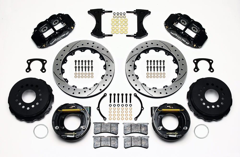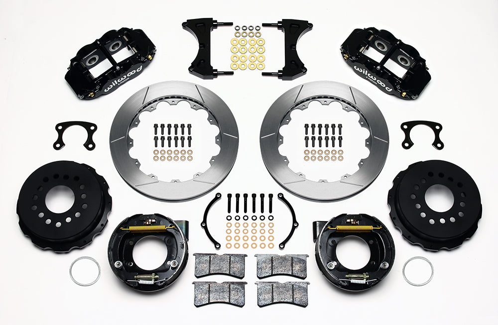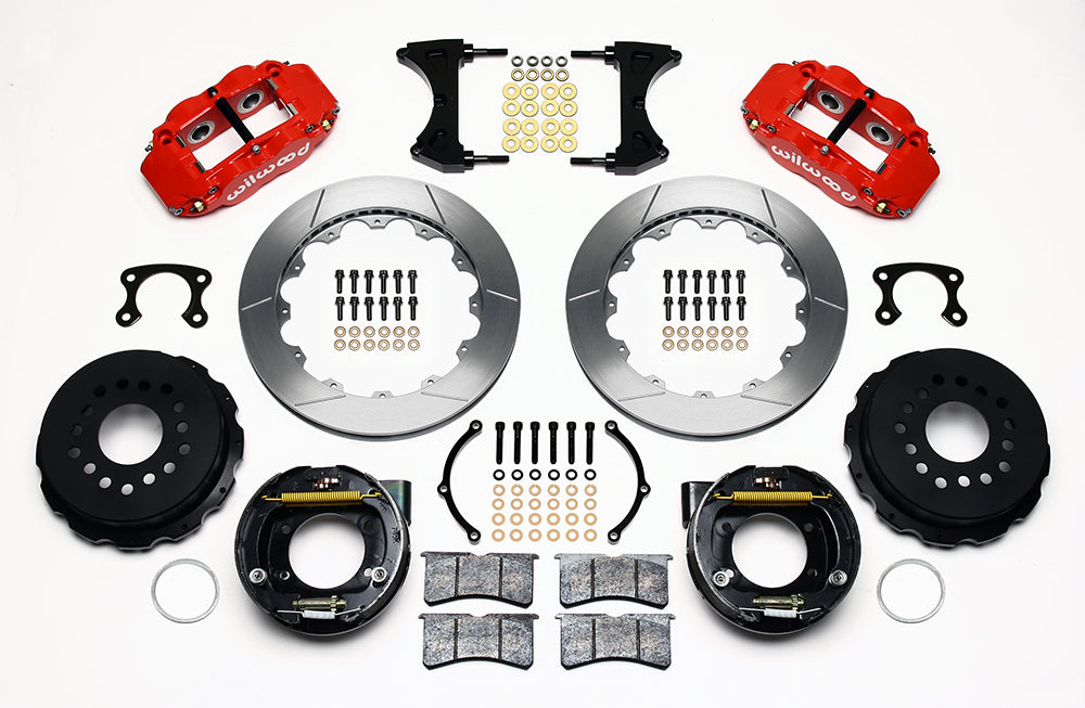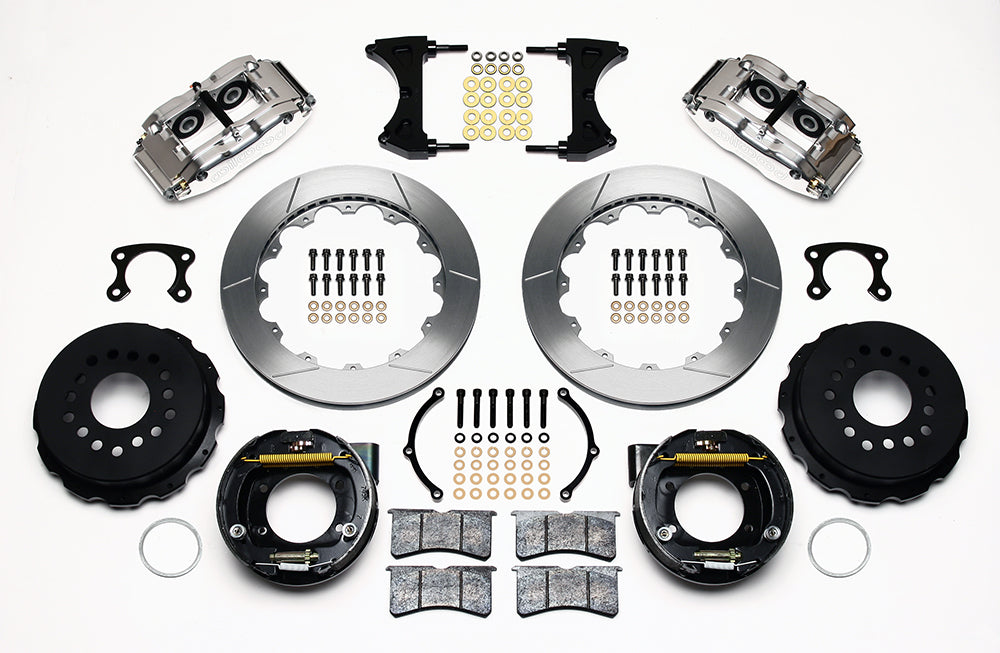 Forged Narrow Superlite 4R rear disc kits provide the ultimate Big Brake solution for popular muscle car rear axles that require a parking brake. FNSL4R four piston calipers, 13” or 14” two-piece rotors, and high performance BP-10 compound pads provide optimized and balanced braking to compliment front big brake upgrades on all types of custom, show and high performance street machines. The neatly hidden internal shoe system provides a clean installation with superior static holding power for parking. Optional caliper finishes and rotor designs allow builders to personalize the style and performance for every application.
