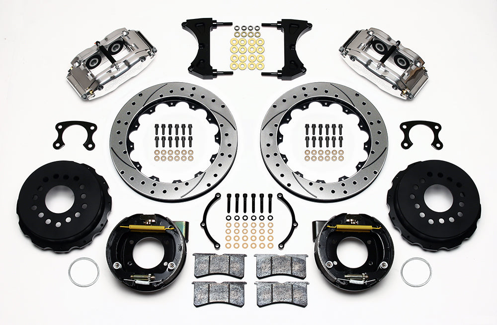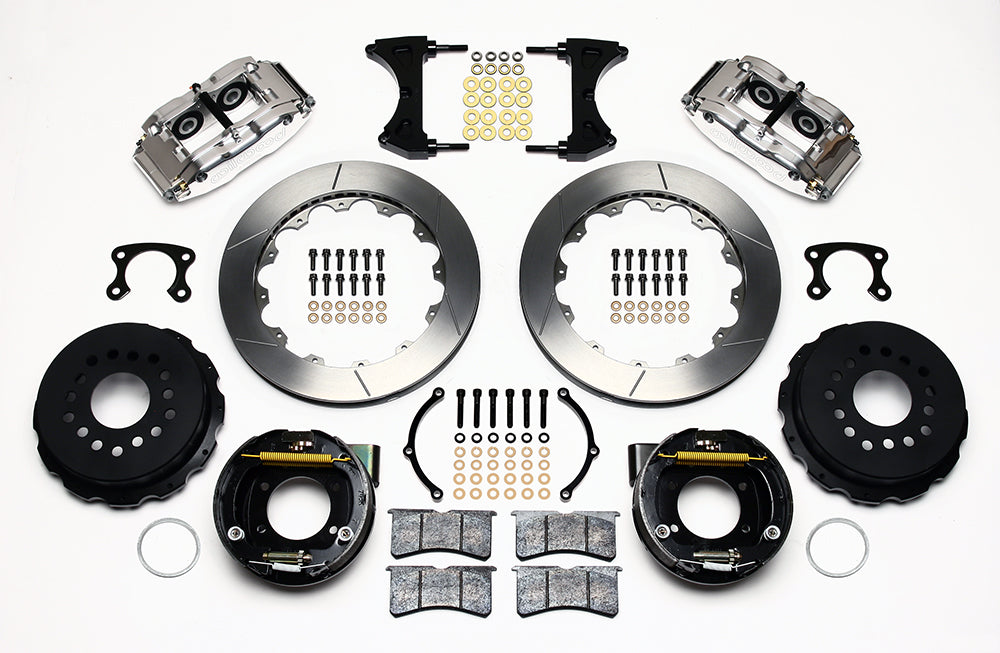 Forged Narrow Superlite 4R rear disc kits provide the ultimate Big Brake solution for popular muscle car rear axles that require a parking brake. FNSL4R four piston calipers, 13” or 14” two-piece rotors, and high performance BP-10 compound pads provide optimized and balanced braking to compliment front big brake upgrades on all types of custom, show and high performance street machines. The neatly hidden internal shoe system provides a clean installation with superior static holding power for parking. Optional caliper finishes and rotor designs allow builders to personalize the style and performance for every application.