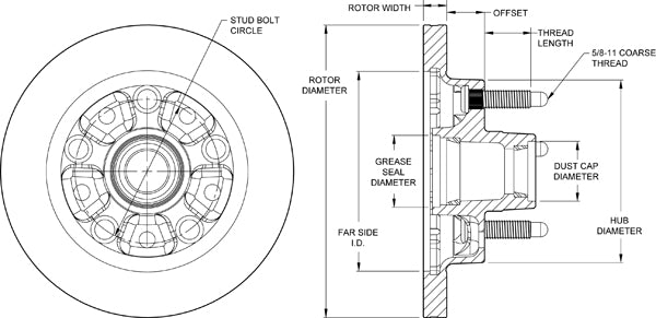 Wilwood's OEM Replacement Racing Rotors for Modifieds: Wilwood Engineering is proud to introduce our OEM-Replacement line of racing rotors to the industry. These rotors were designed utilizing the latest developments in iron formulation technology using our proprietary blend ferrous alloy to bring you the strongest, lightweight, most dependable rotor available in the market place. The rotors are new castings, not reworked parts and our tolerances are held to the high standards you have come to expect from Wilwood Engineering. Ford Hybrid rotors come standard with races and 5/8” coarse wheel studs installed in the 5 on 5 bolt pattern. Standard rotors come with 2.14 in long studs. LS rotors come with an increased length, 3.14 in long wheel stud to simplify wheel spacing. The Ford Hybrid version is 10.15” diameter by .810” thick rotor that fits the 1974-1980 Pinto spindles. Bearing & hardware kits for Hybrid rotor is available under part no. 370-9545. Bearing kits include: inner bearing, outer bearing, dust cap, spindle nut, washer, cotter pin, and seal.