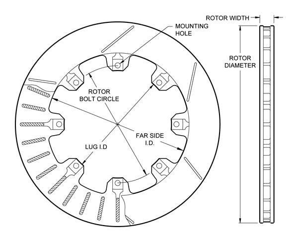 Every Wilwood rotor is cast from premium grade, long grain carbon iron. This material exhibits long wear, high thermal stability, and excellent resistance to distortion in high heat. Modern foundry and machining techniques hold close tolerances on face and vane thickness. Combining the correct face thickness with a 32 vane casting provides superior heat management and long service life with low rotating and unsprung weight. The straight vane design also makes it possible to use the same rotor on left or right hand mounting locations.